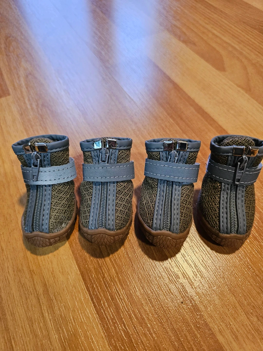 These dog boots are designed for protection and comfort. They feature a durable sole with textured grip and a secure zipper closure with an adjustable strap. The size is 2, and they come as a set of four.