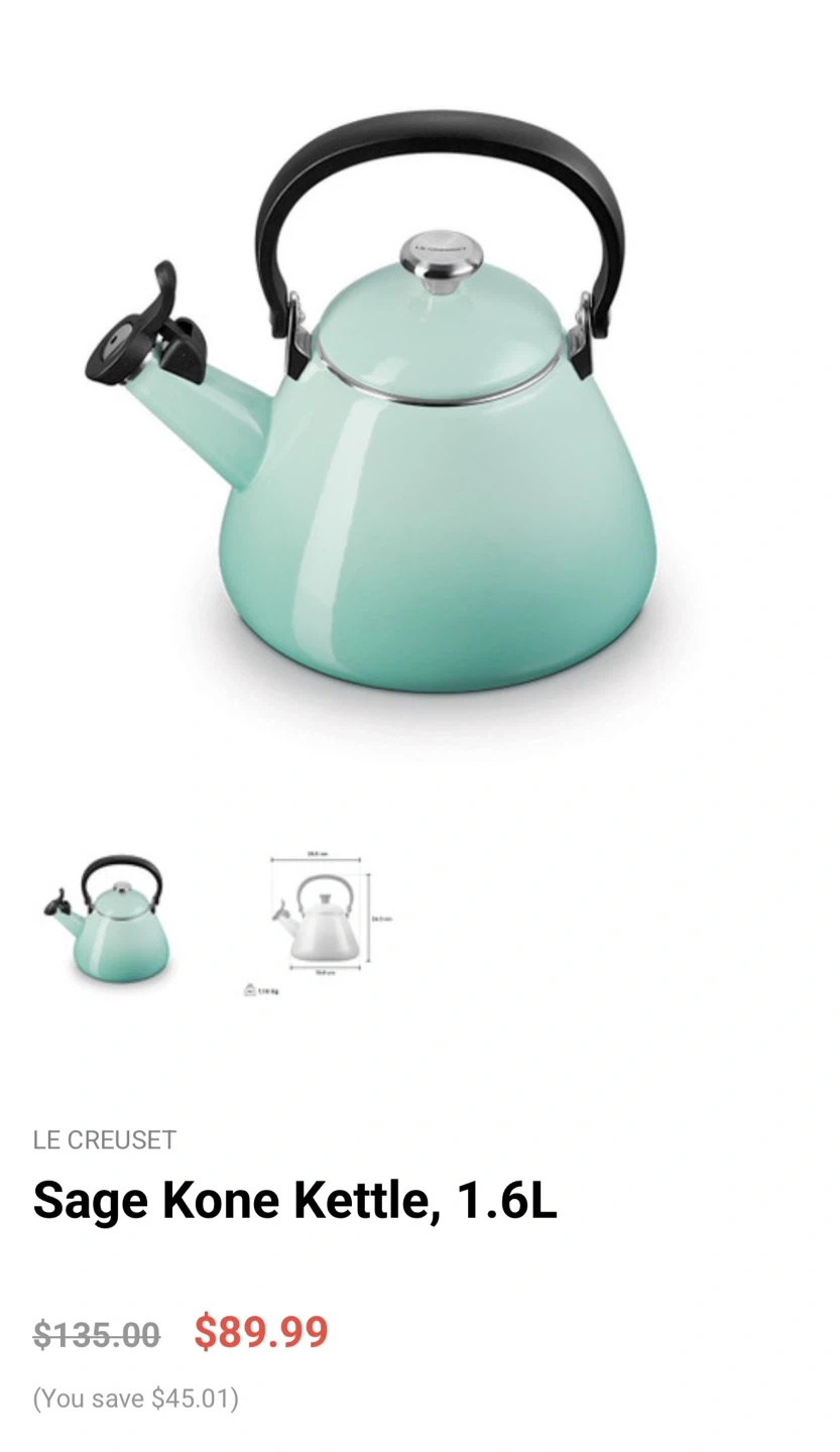 This is a Le Creuset Sage Kone Kettle with a 1.6L capacity. It's a lovely mint green colour. The kettle is made from durable enamel-coated steel. Perfect for making a warm brew on a chilly morning!