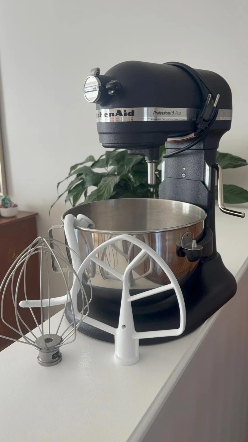 This is a black KitchenAid Professional 5 Plus stand mixer. It comes with a stainless steel bowl and three attachments: a wire whisk, a flat beater, and a dough hook.