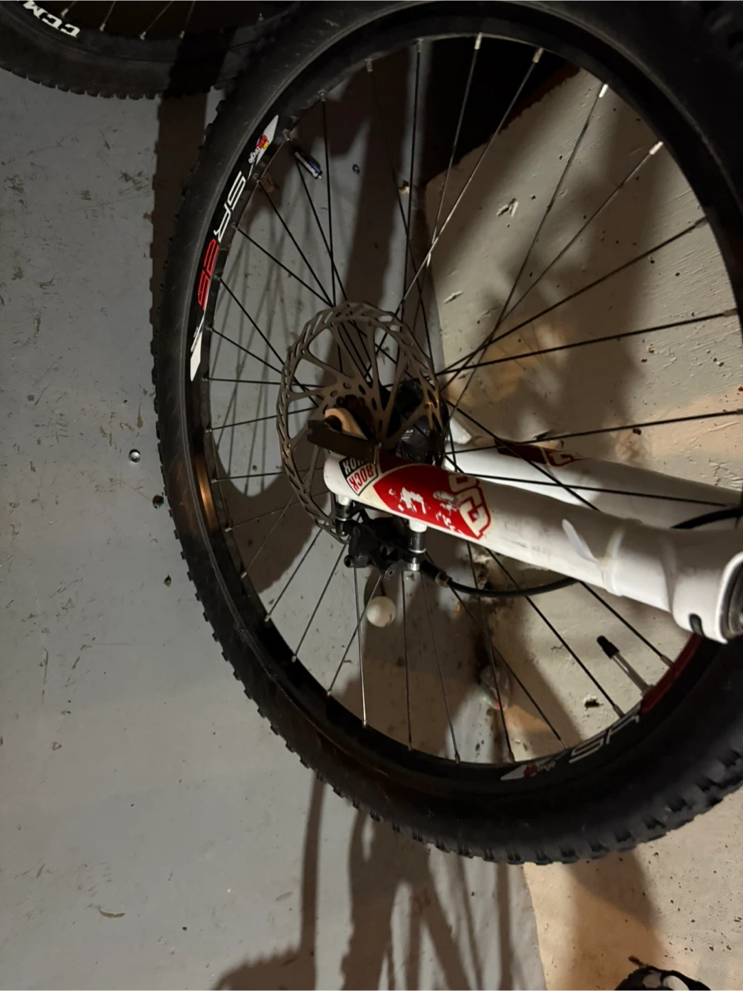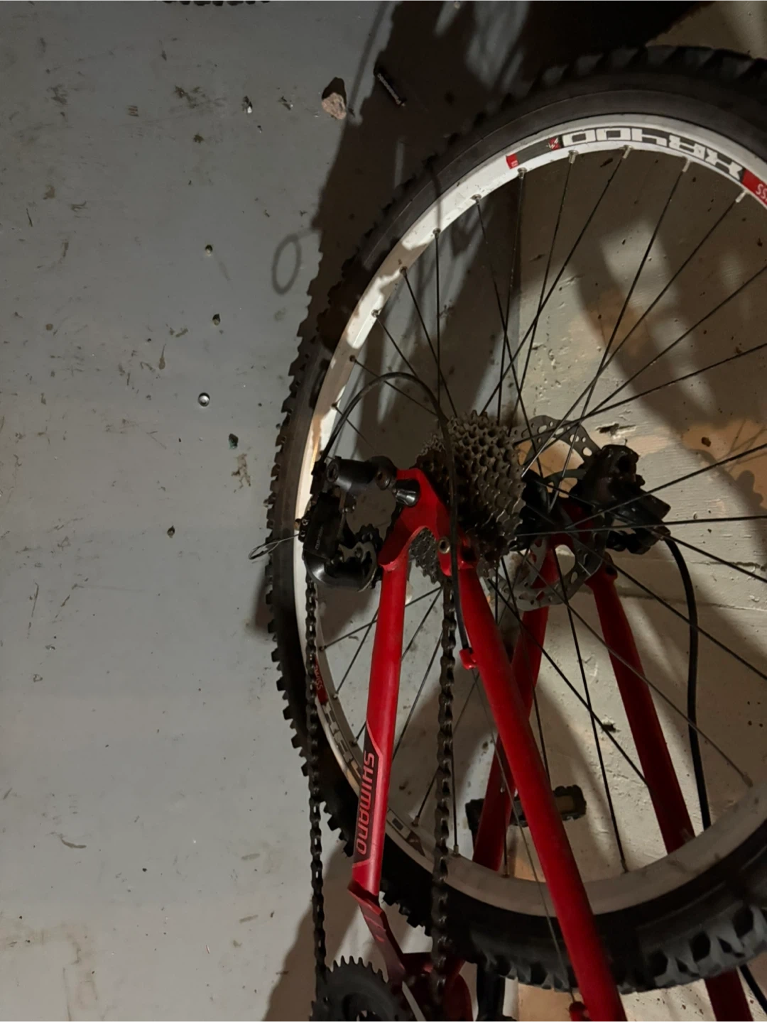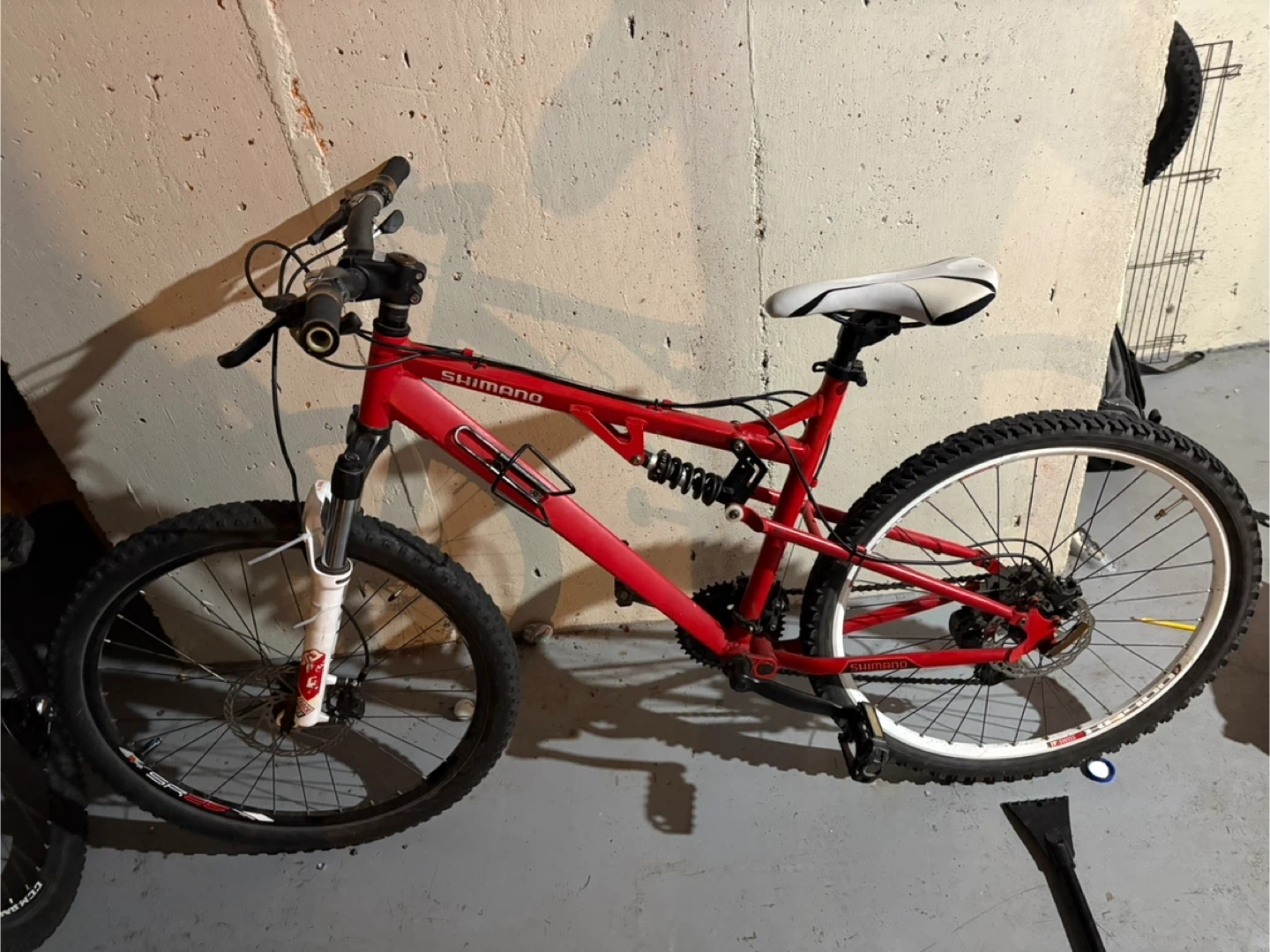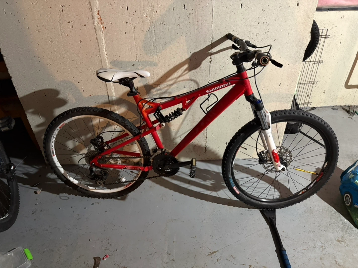 This is a red full suspension mountain bike. It has a Shimano drivetrain and RockShox front forks. It has hydraulic disc brakes, front and rear.