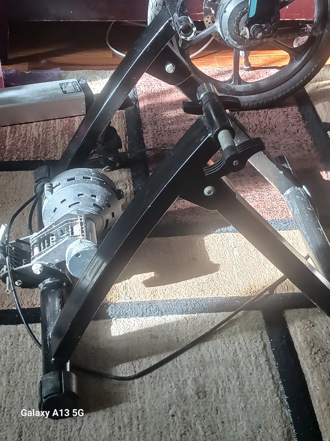 This is a bicycle turbo trainer that allows you to ride your bike indoors. It's made of black metal and has adjustable feet for stability. The trainer holds your rear wheel and provides resistance for a workout. Used once put to take on dust $25