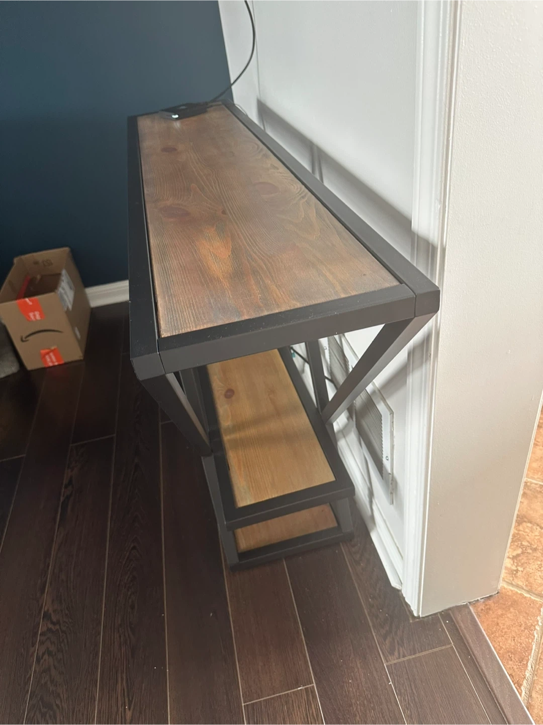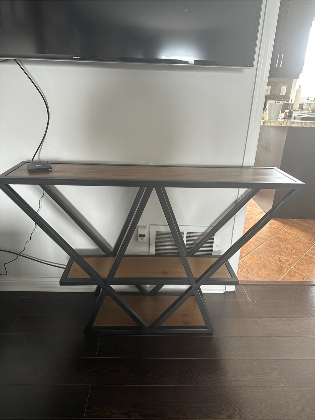 Console table with a rustic wooden top and a black metal geometric frame. It features two shelves for storage or display. This table would look great in an entryway or living room.