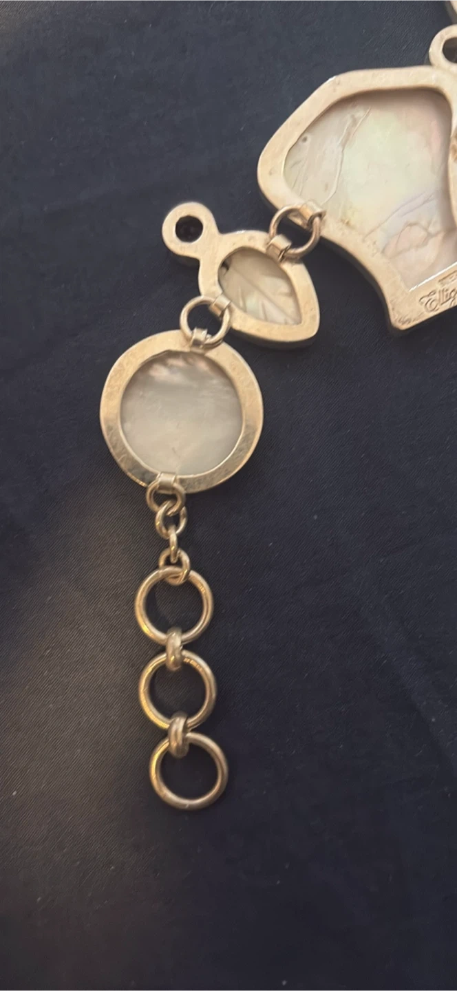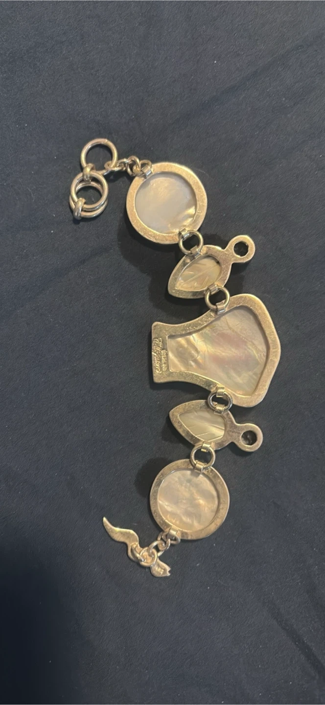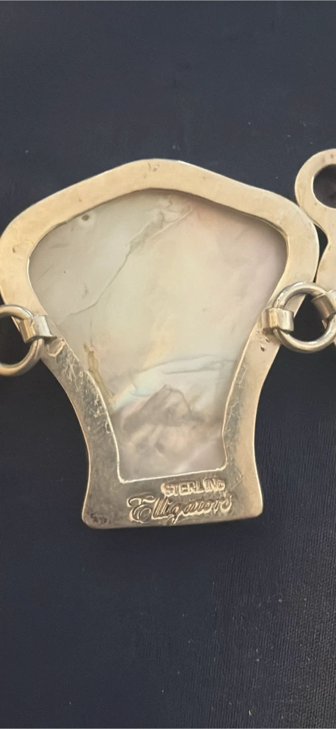 Sterling silver bracelet with a carved mother of pearl elephant. It features mother of pearl cabochons and clear stones. Bracelet measures approximately 7 inches in length.