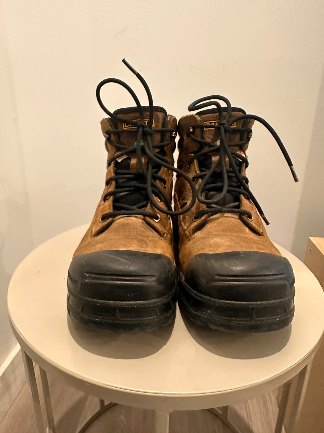 Brown leather work boots with black toe caps and soles. Waterproof construction. Lace-up closure for a secure fit. These boots are built for durability on the job site.