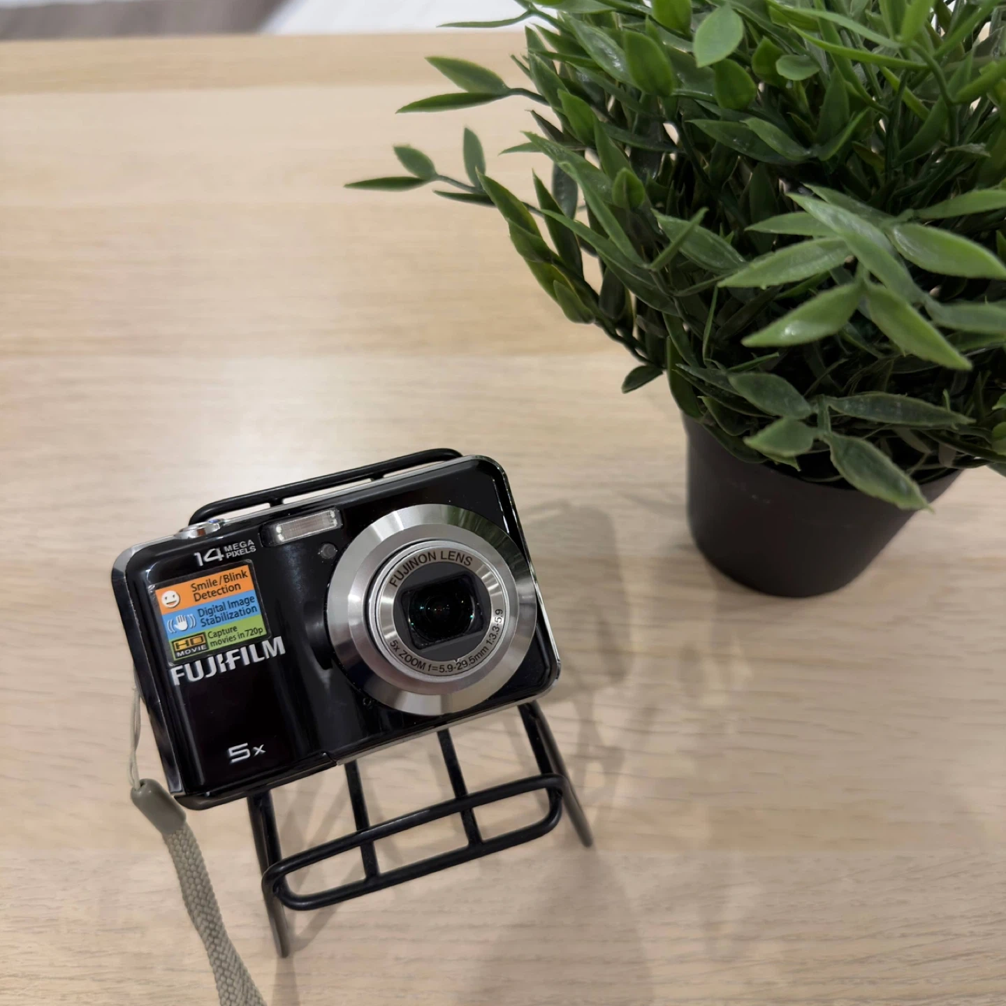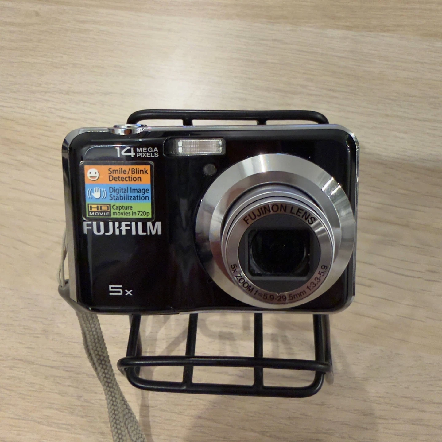 This Fujifilm FinePix AX300 is a black digital camera with 14 megapixels. It features Smile/Blink Detection and Digital Image Stabilization. It can capture HD movies in 720p and has a 5x optical zoom.