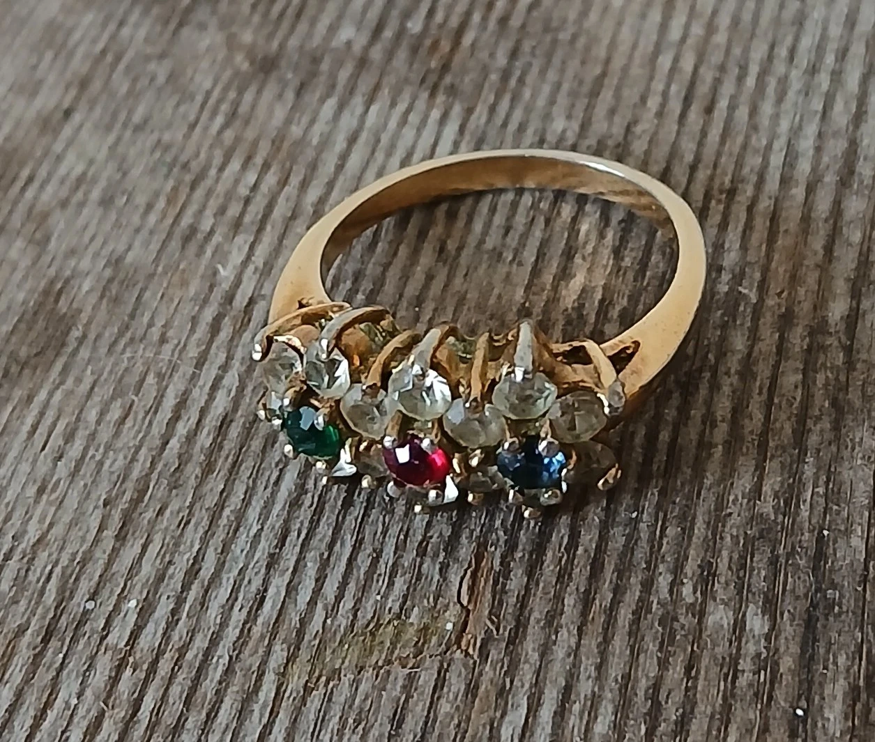 This gold-tone ring features a band set with colourful gemstones. It includes clear, green, red, and blue stones. This ring would make a nice addition to any jewellery collection.