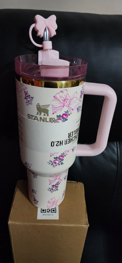 This is a Stanley Loveshack Quencher H2.0 tumbler. It's a large capacity mug with a handle and a straw lid. The design features a floral pattern with pink bows. brand new in box