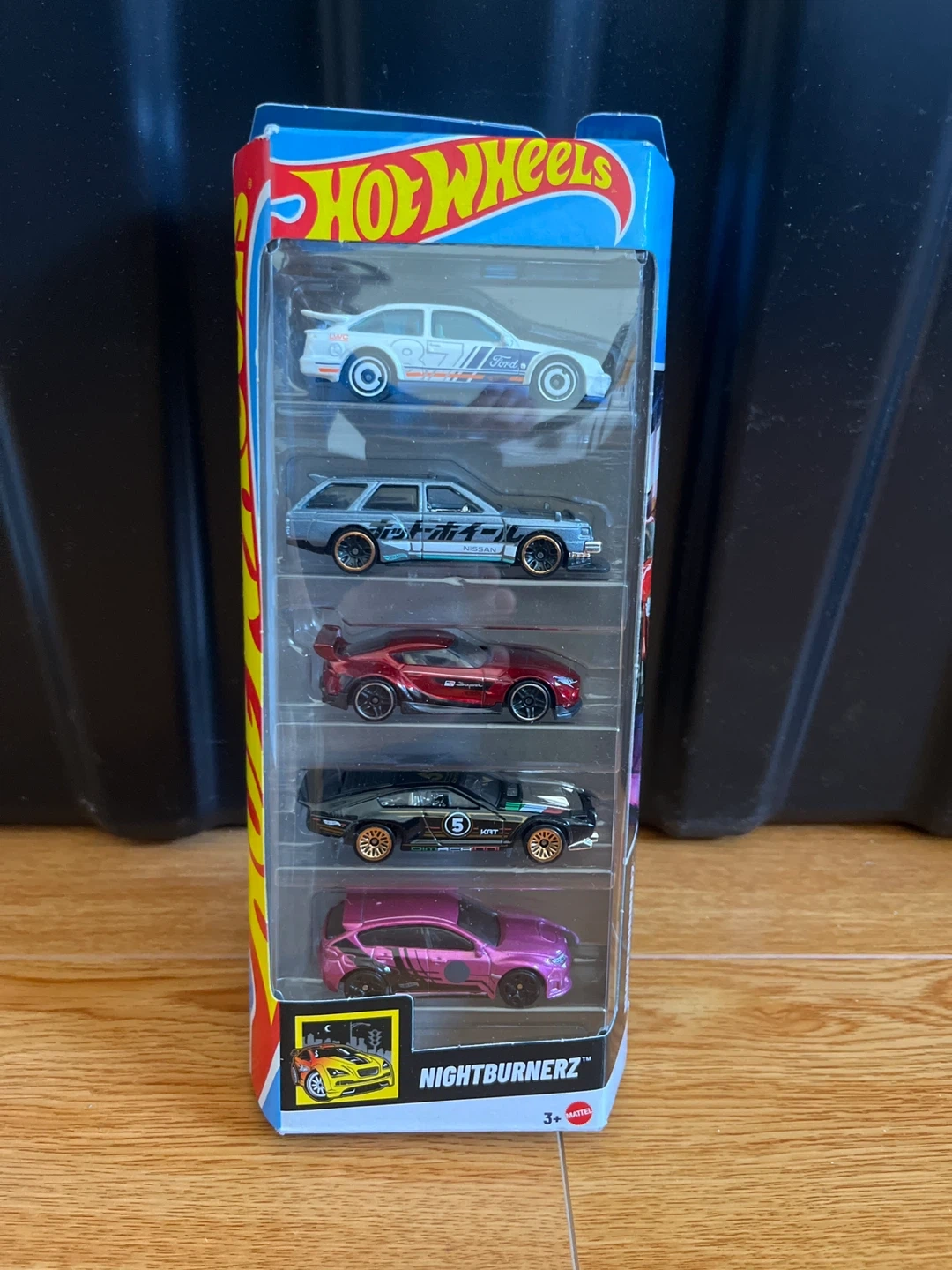 This Hot Wheels gift pack features five miniature cars from the Nightburnerz collection. Includes assorted vehicles in a display case. Recommended for ages 3 and up.