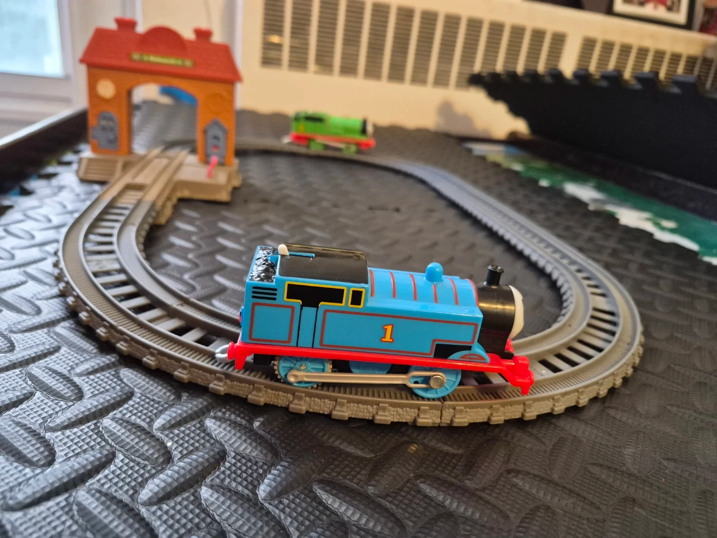 A fun train set featuring Thomas the Tank Engine and a friend. Includes train tracks and a station house. Great for little engineers!