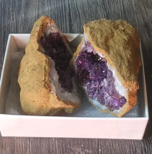 This geode has been split in half to reveal sparkling purple crystals within. It's presented in a white display box. The exterior has a rough, natural texture.
