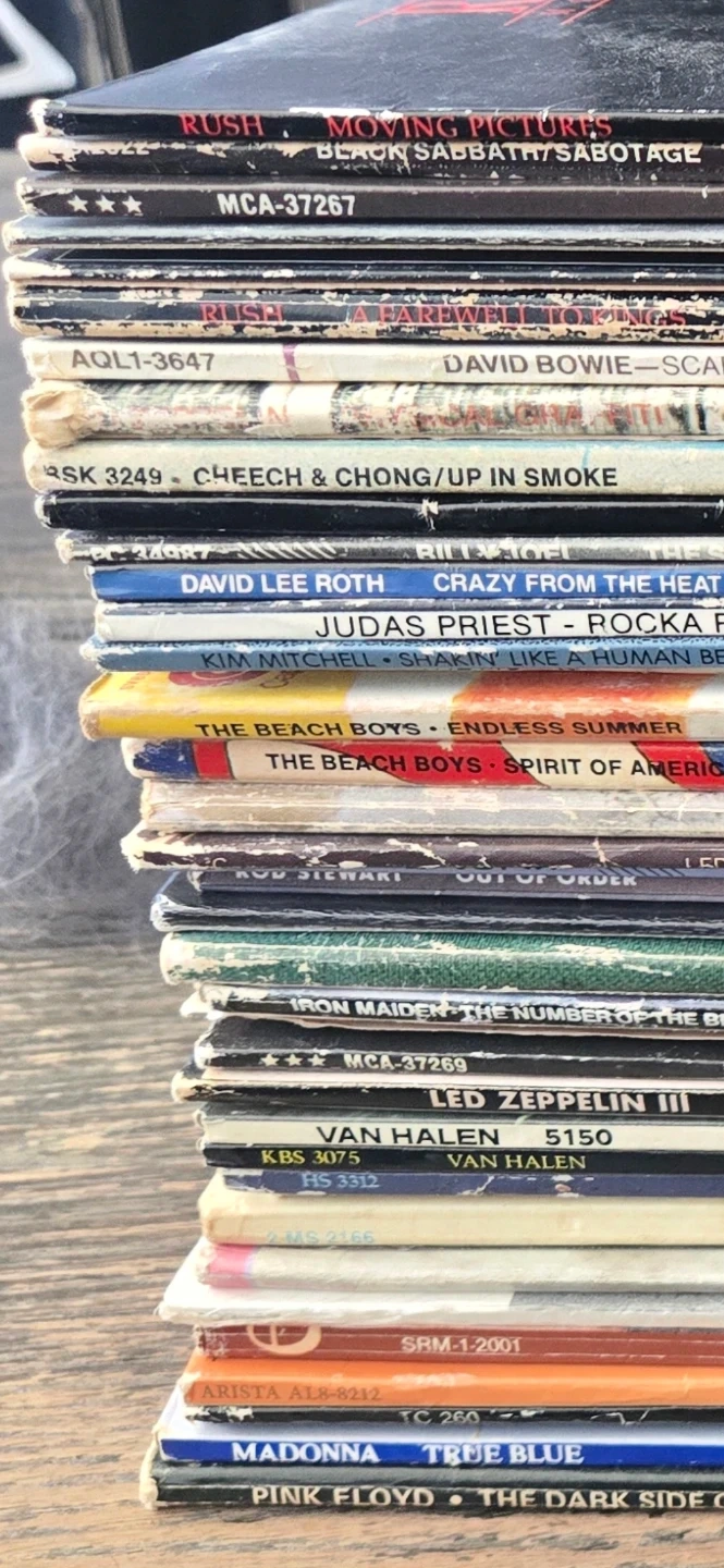 A collection of vinyl records featuring various artists. Includes albums from Rush, Black Sabbath, Madonna, Pink Floyd, and more. Great for any music enthusiast!