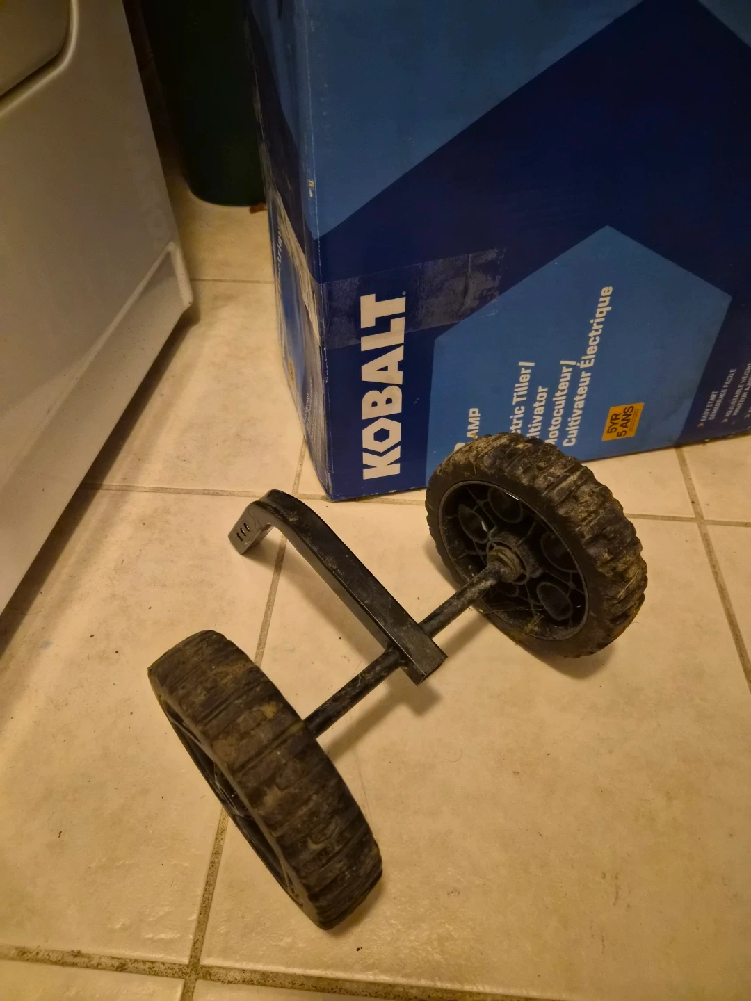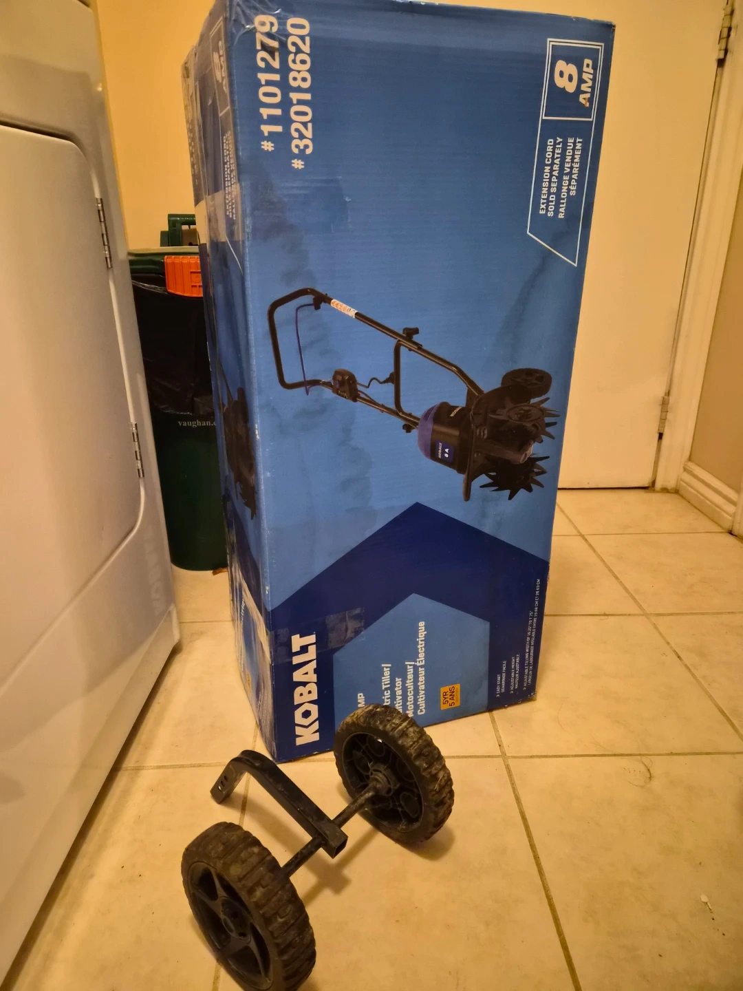 Kobalt electric tiller cultivator with an 8 Amp motor. It has a tilling width of 13.5 inches and a tilling depth of 8 inches. Includes wheels, handle assembly, and owner's manual. Only used once last summers