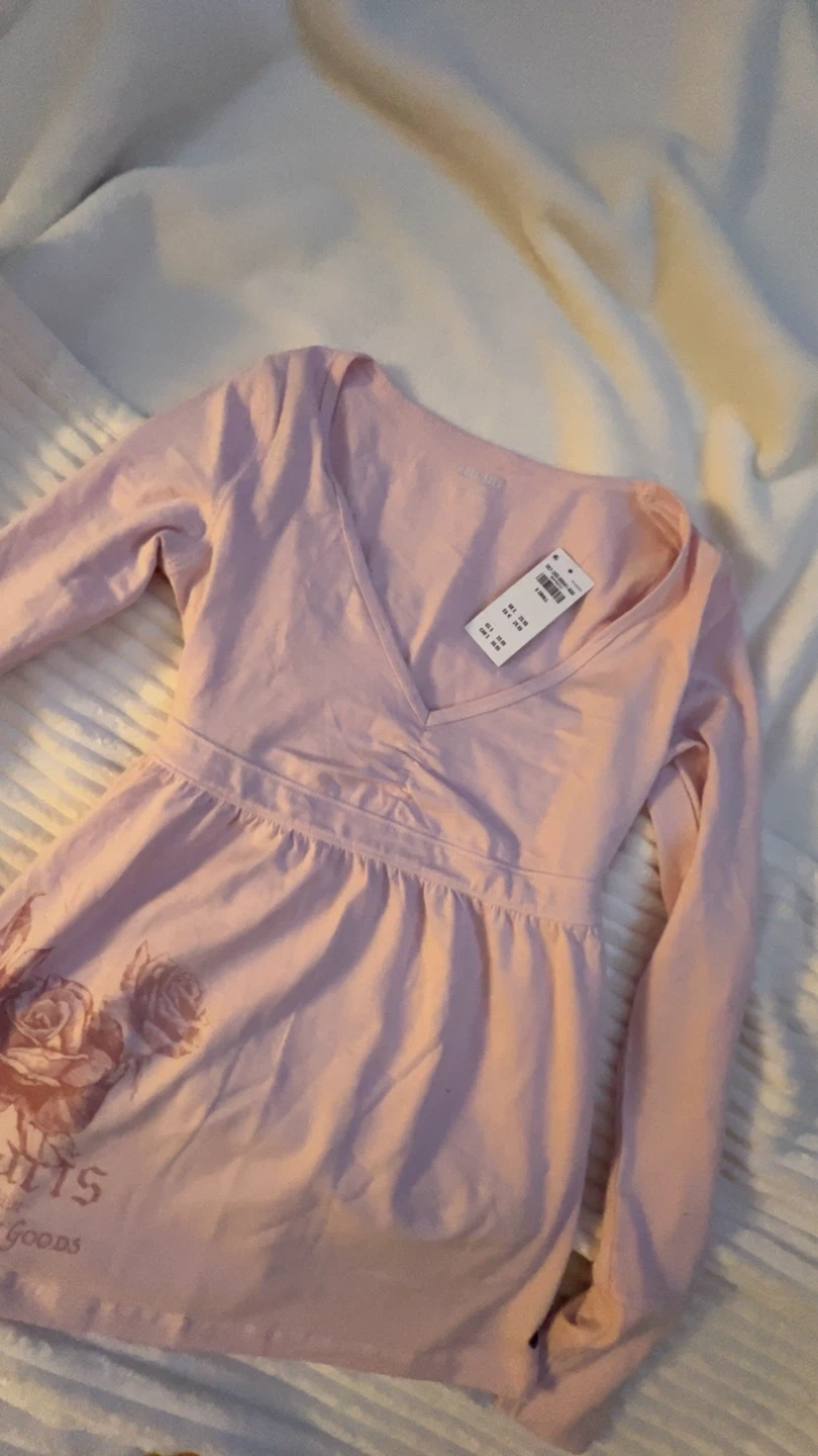 This is a pink Hollister long sleeve t-shirt. It's a size XS with a V-neckline and ruched detail at the waist. Features a floral graphic on the front. This is brand new, only tried on once.