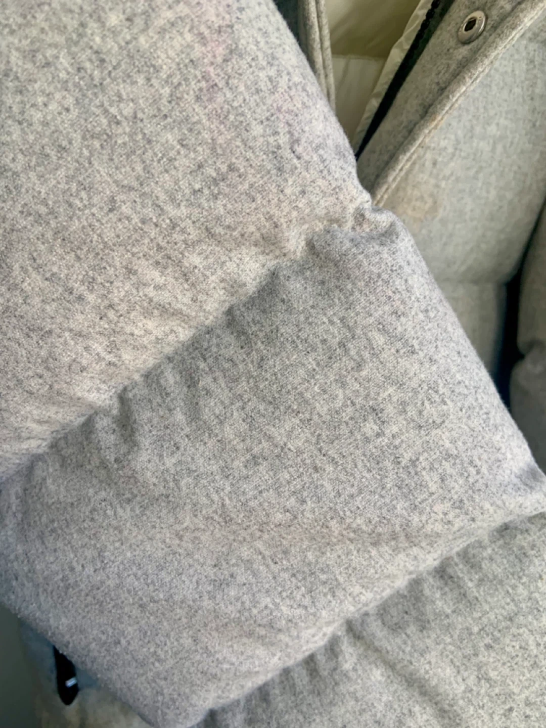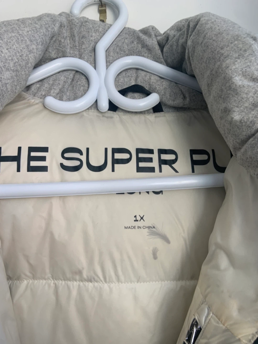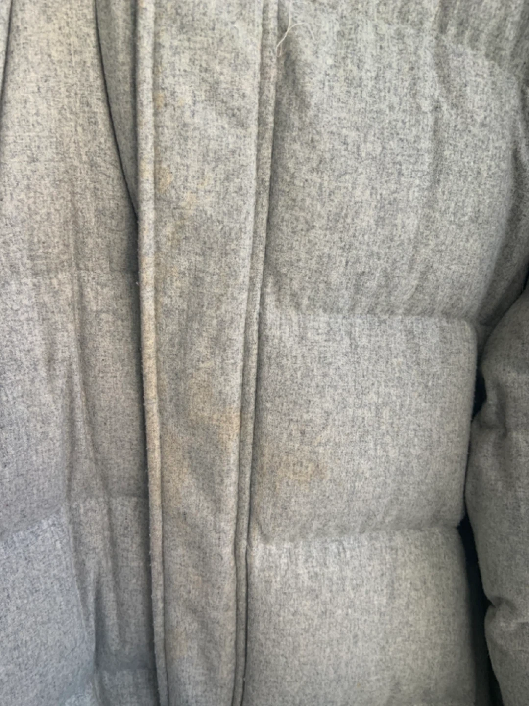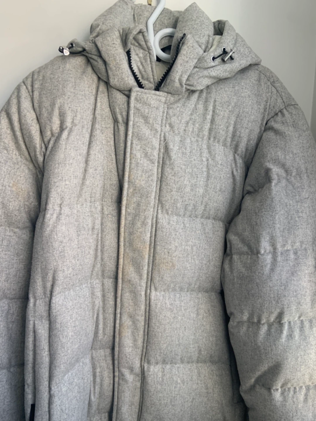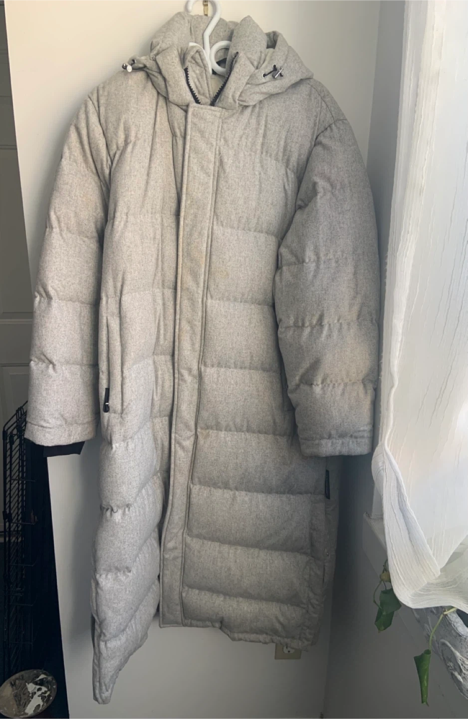 This is a grey, long puffer jacket from Aritzia. It's a size 1X. It's been well-loved and has some light stains on the front, but still has lots of wear left in it!