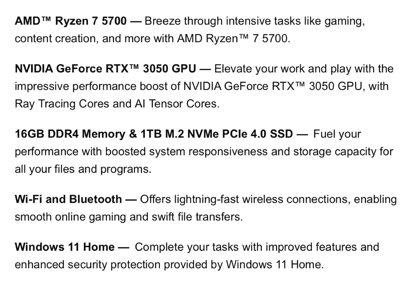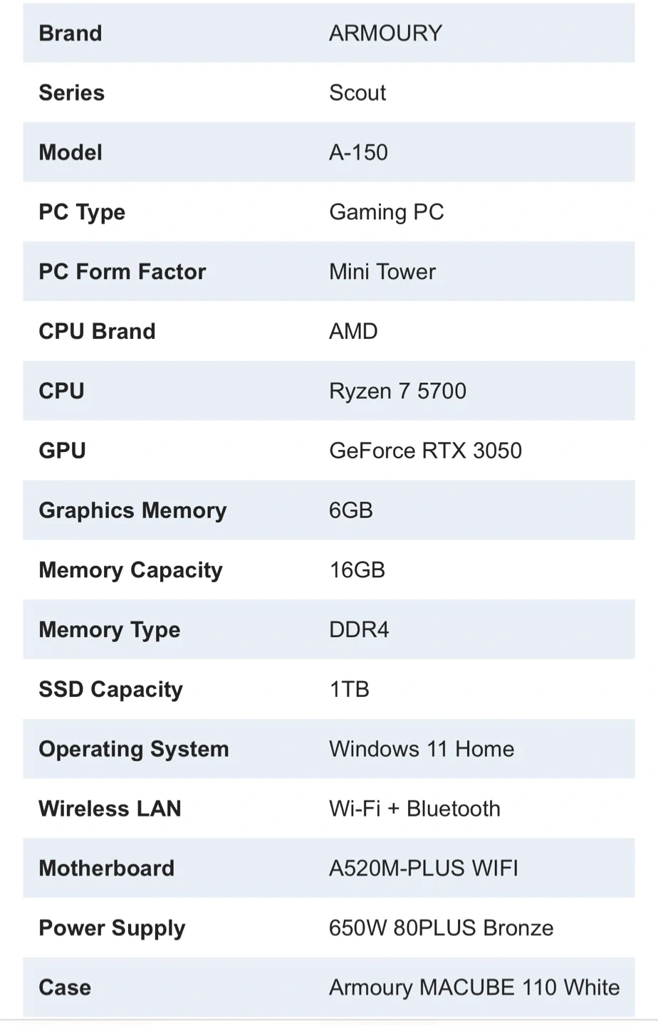 ARMOURY Scout A-150 gaming PC. It's a mini tower with an AMD Ryzen 7 5700 CPU and NVIDIA GeForce RTX 3050 GPU. Includes 16GB DDR4 RAM and a 1TB SSD. Runs on Windows 11 Home with Wi-Fi + Bluetooth.