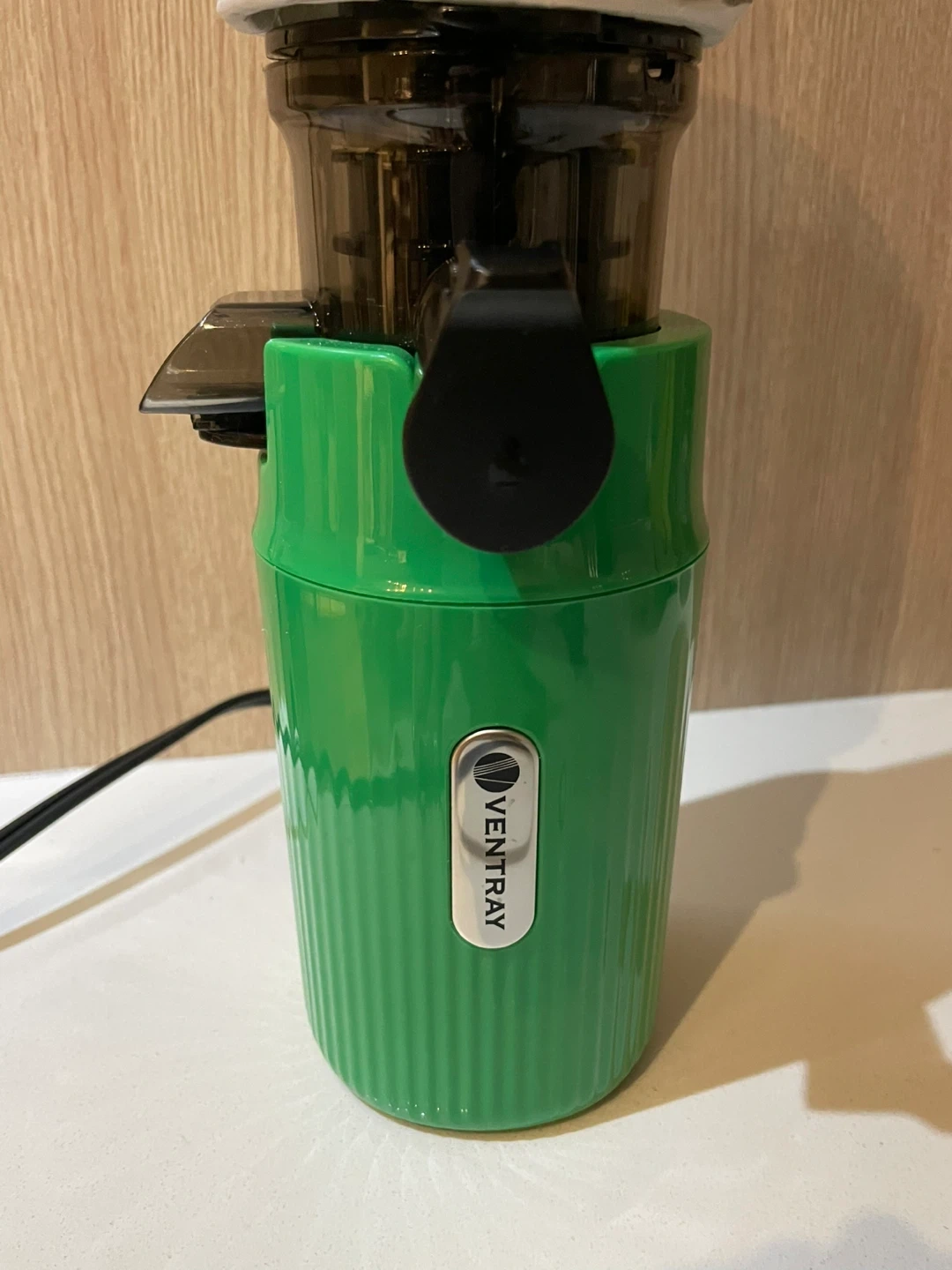 This Ventray cold press juicer is Parrot Green. It's a masticating juicer that spins at 60 RPM. It comes with a cleaning brush and is easy to clean. Great for making healthy juices!