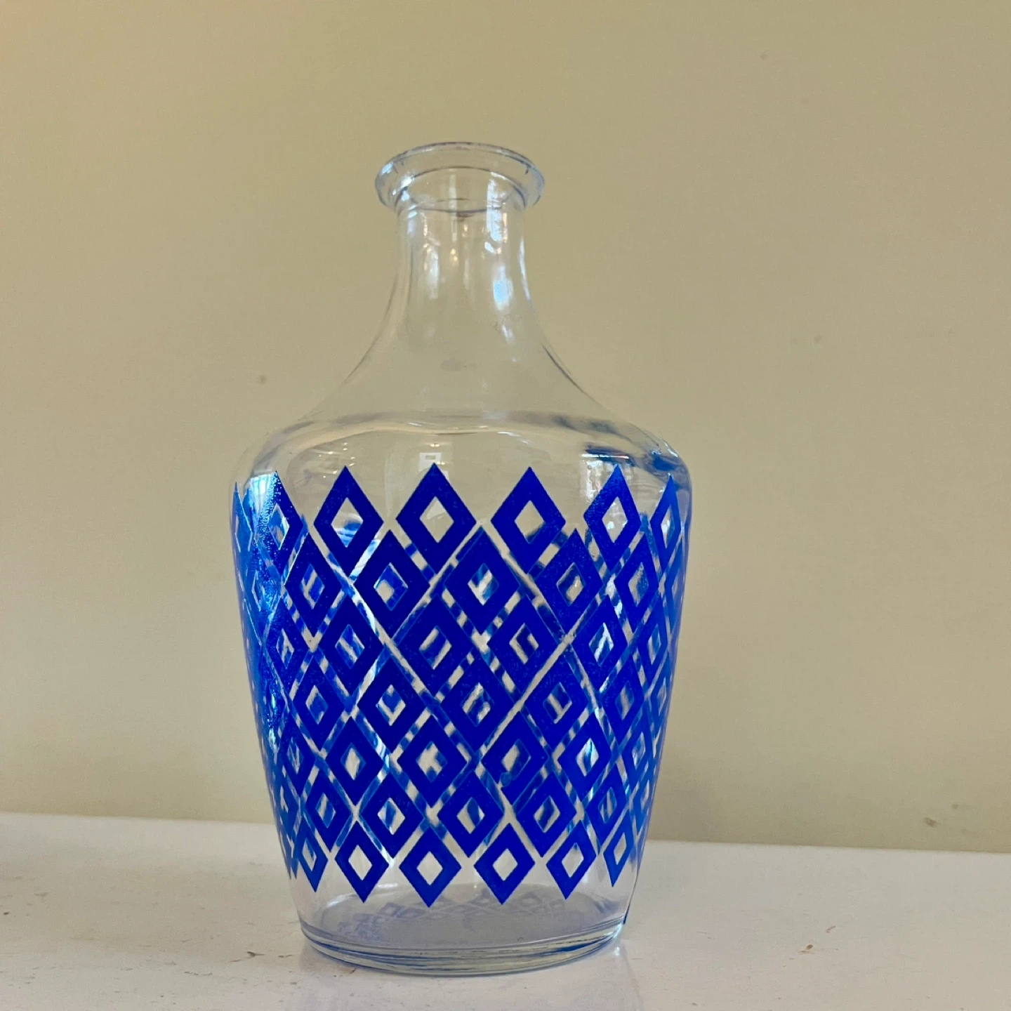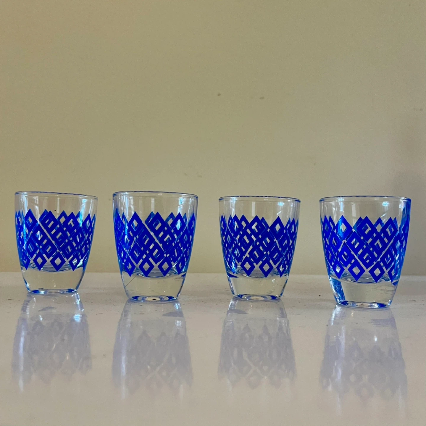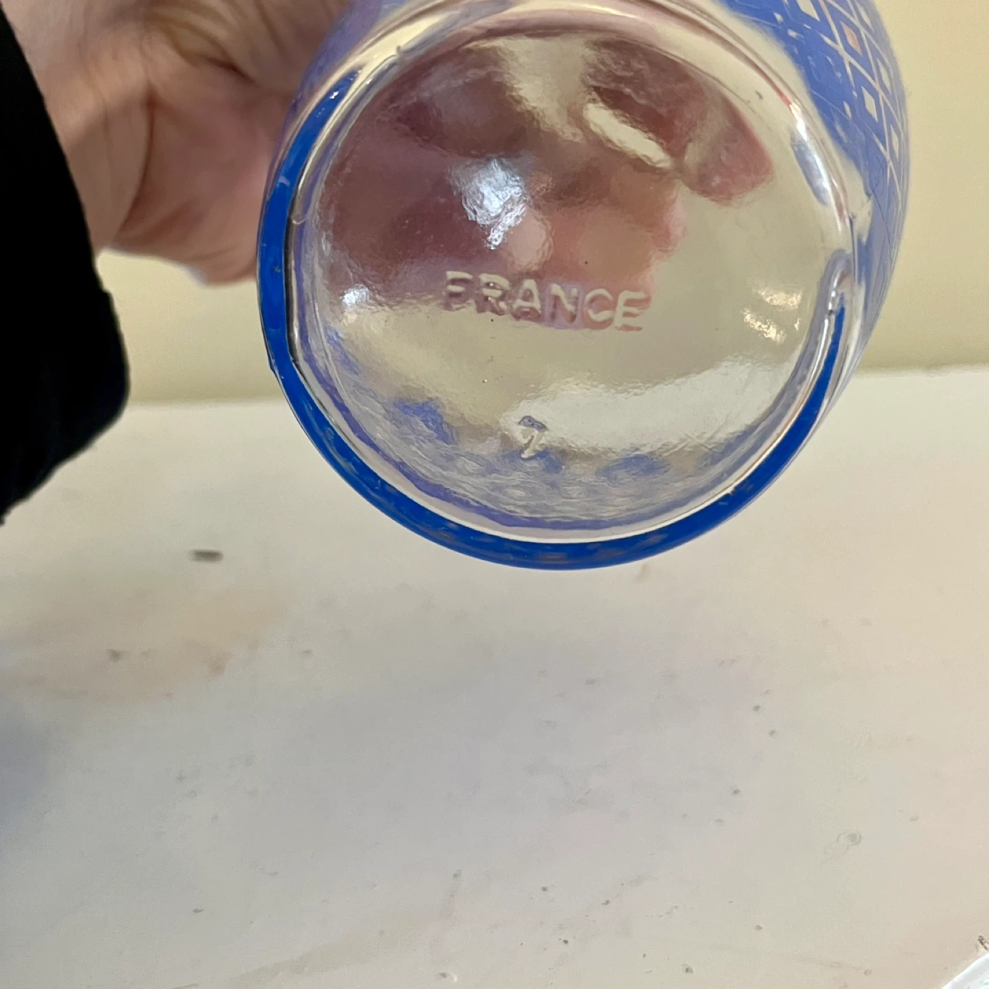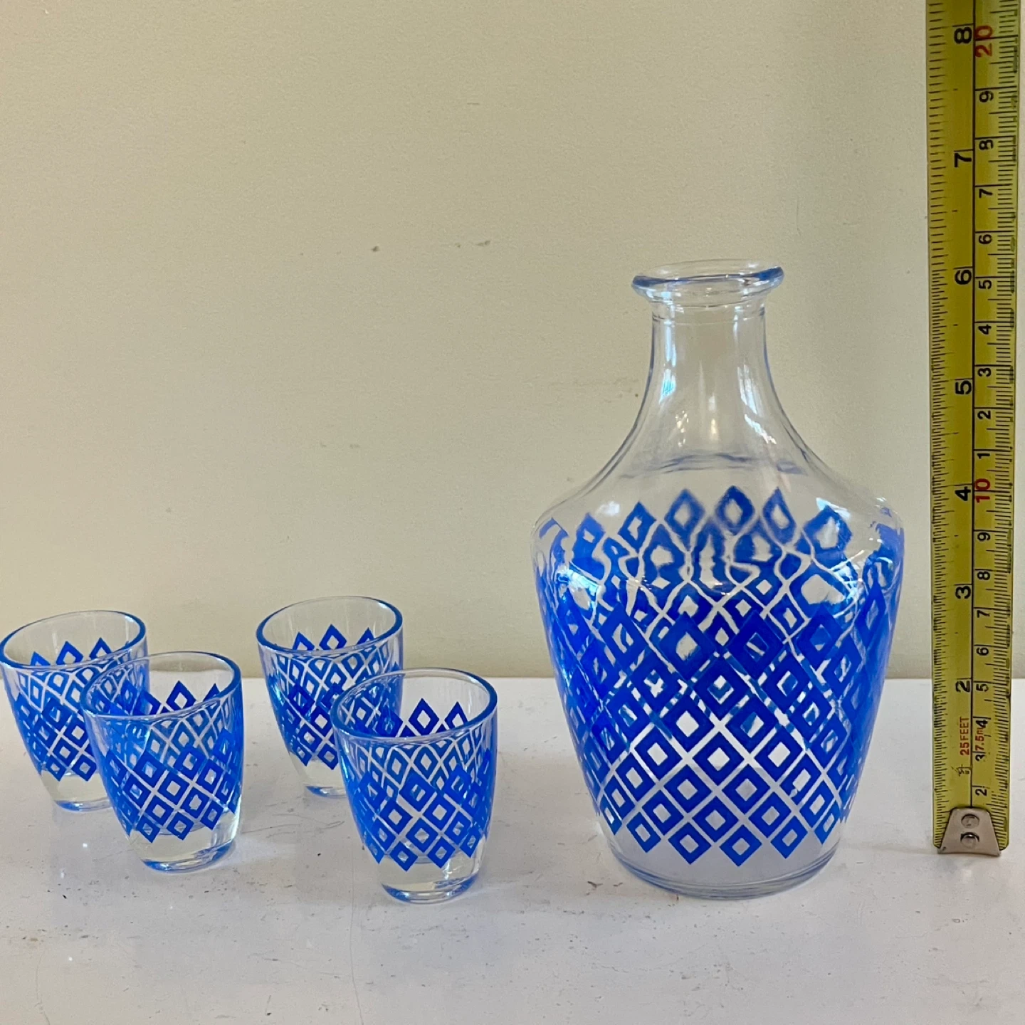 MCM Cristallerie D'Arques liqueur decanter set includes a decanter and four glasses, perfect for serving your favourite spirits. The set is in good, used condition, showcasing a lovely blue diamond pattern. The base of each item reads, "France”.