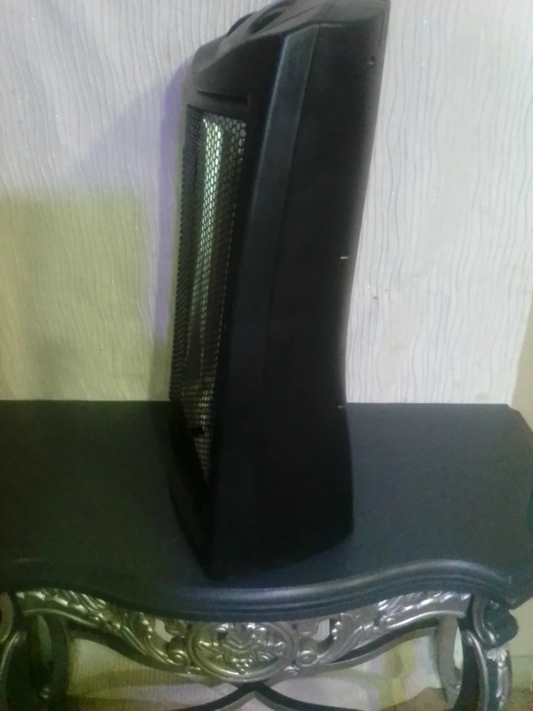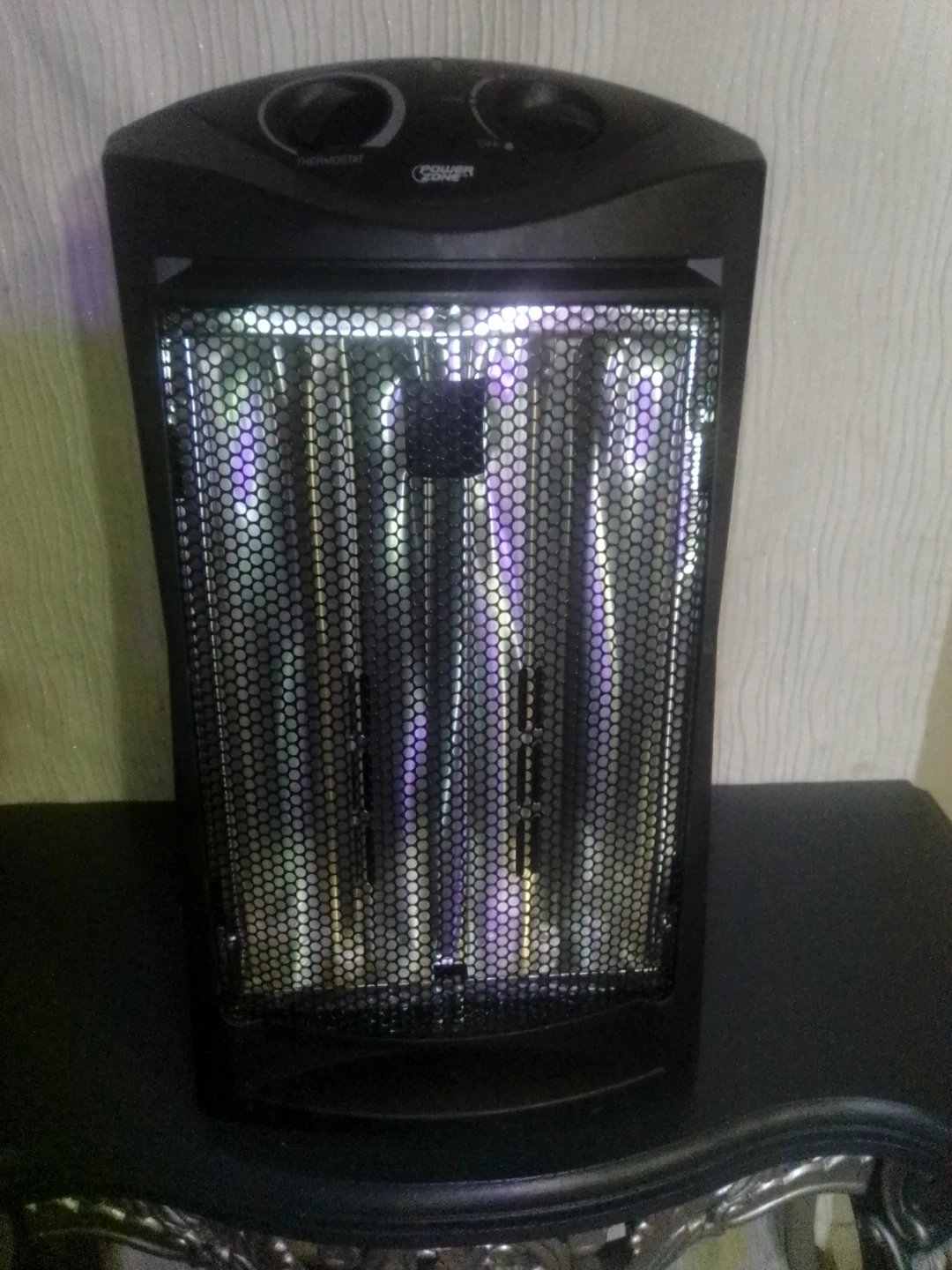 This is a Power Zone electric heater. It has two heat settings, low and high, and a thermostat control. It's black and has a mesh front with heating elements behind it. 24x12x7