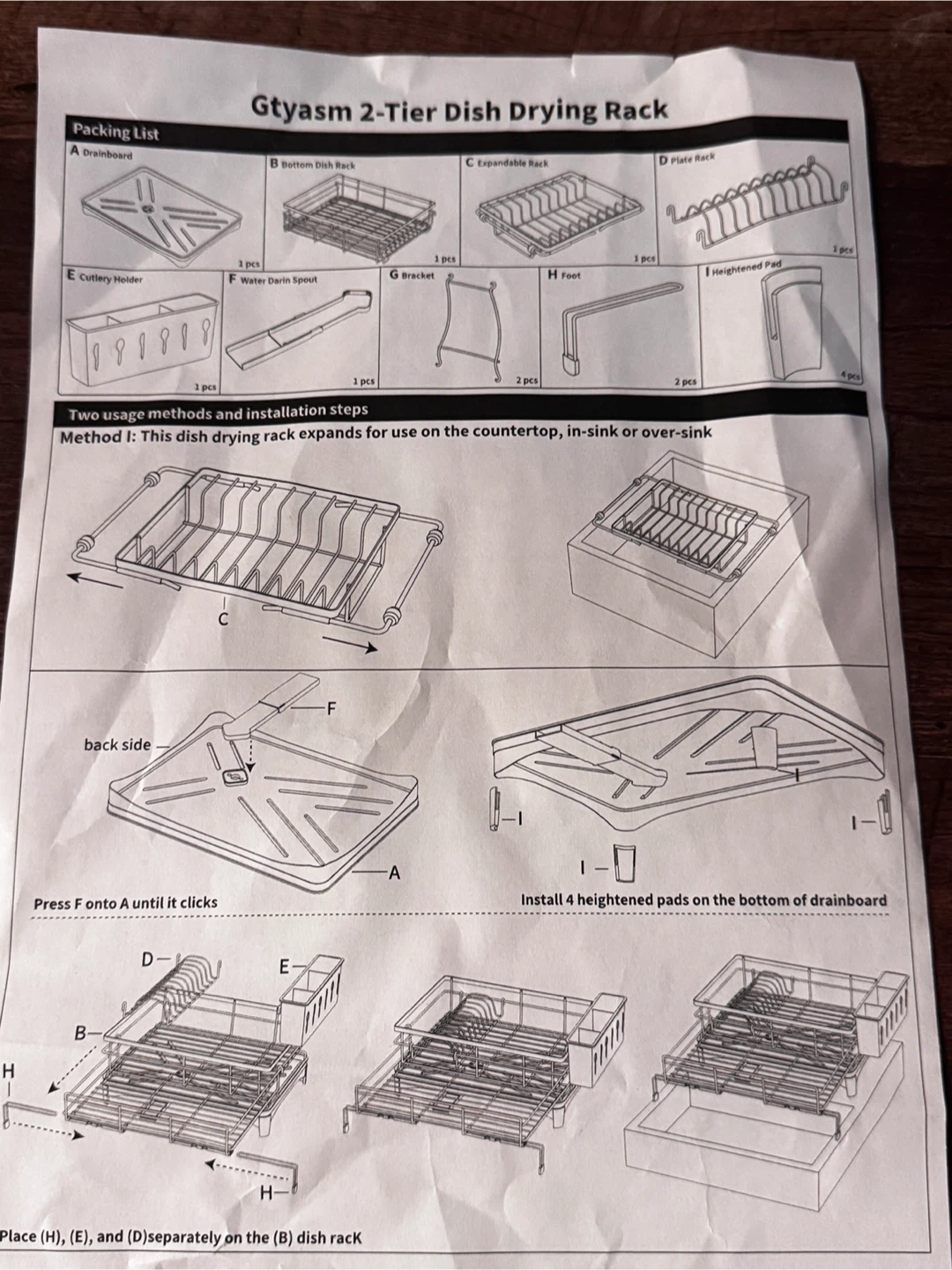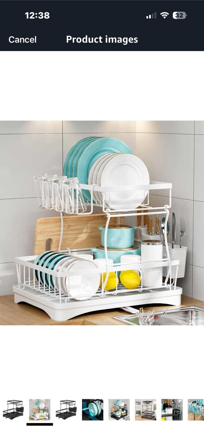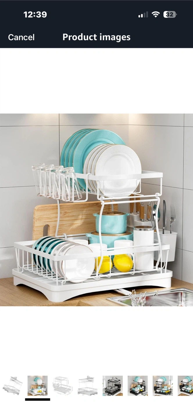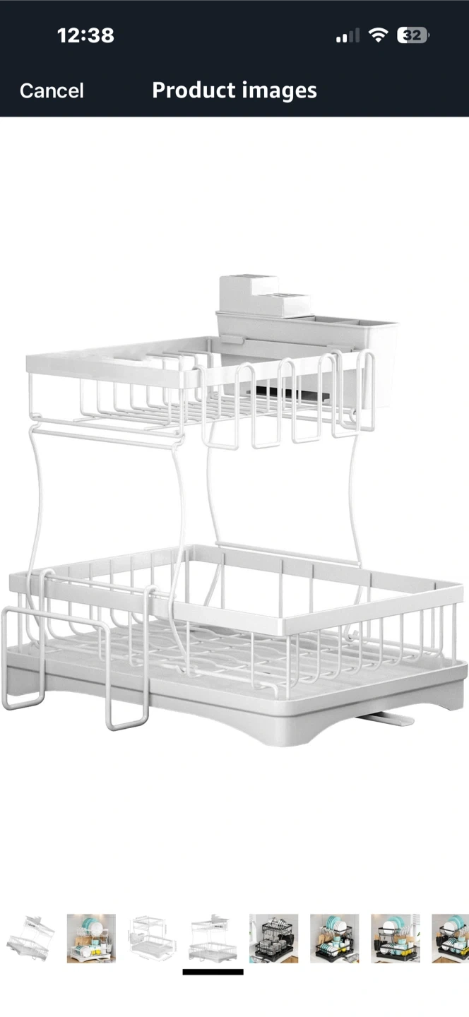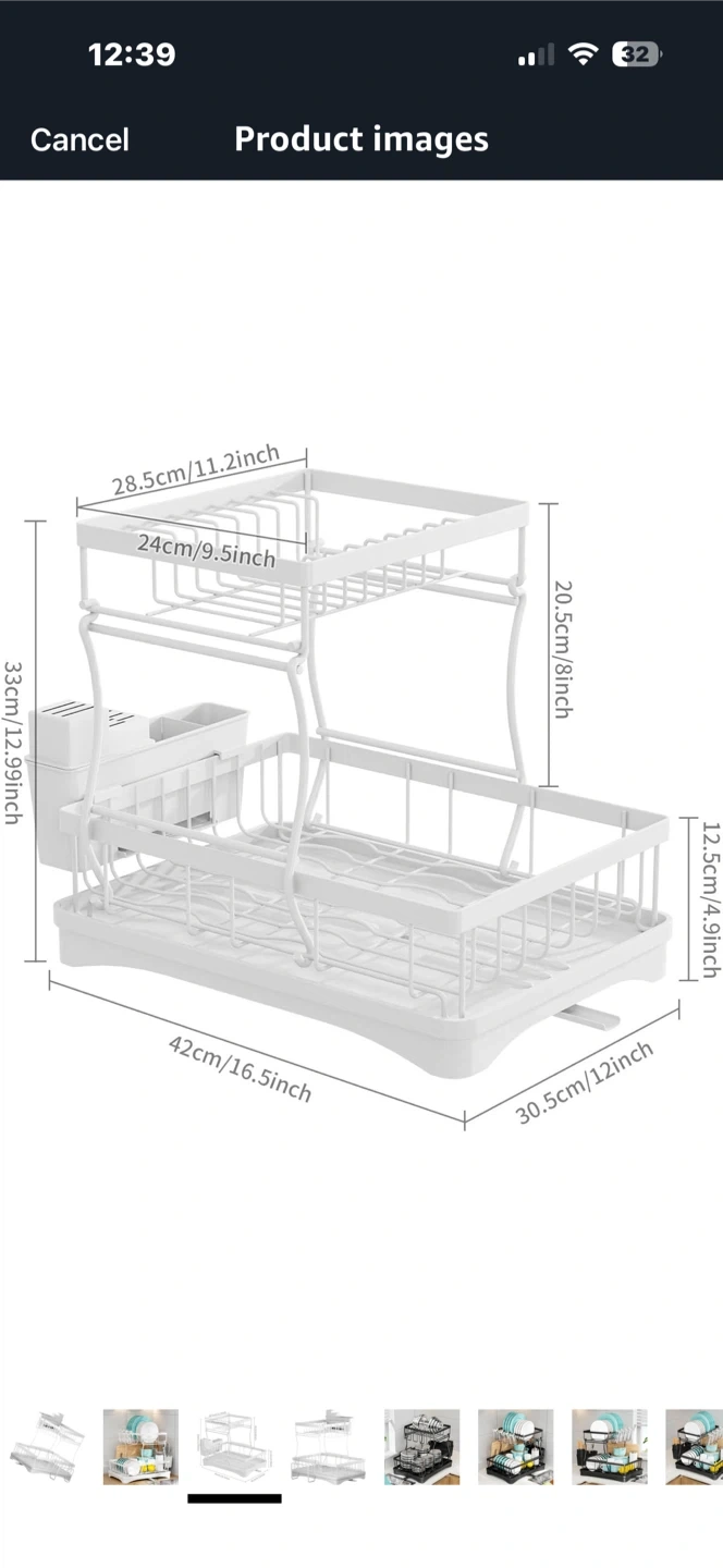 This is a white metal dish drying rack with two tiers and an included utensil holder. It has ample space for plates, bowls, and glasses. Dimensions are 42cm x 30.5cm x 33cm.