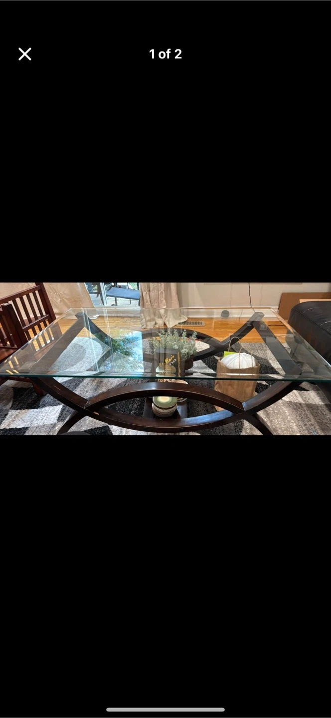 This coffee table features a sleek glass top and a unique dark wood base with a lower shelf. It's a stylish addition to any living room. The glass is transparent, and the base is made of dark, stained wood.