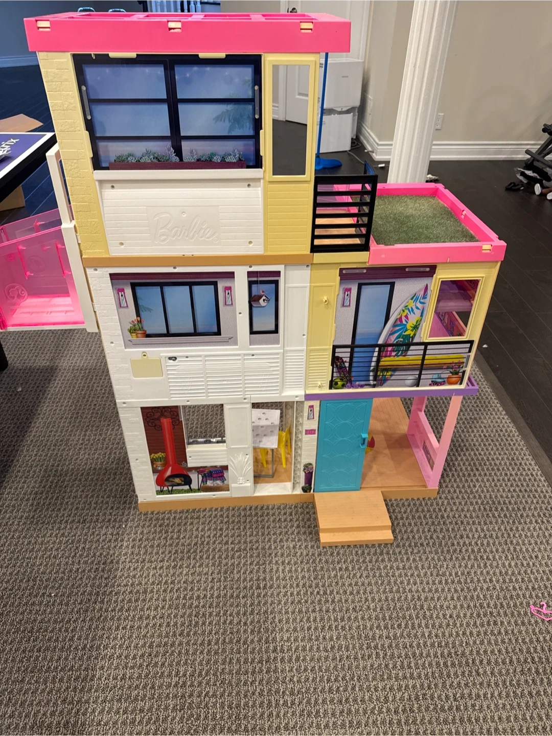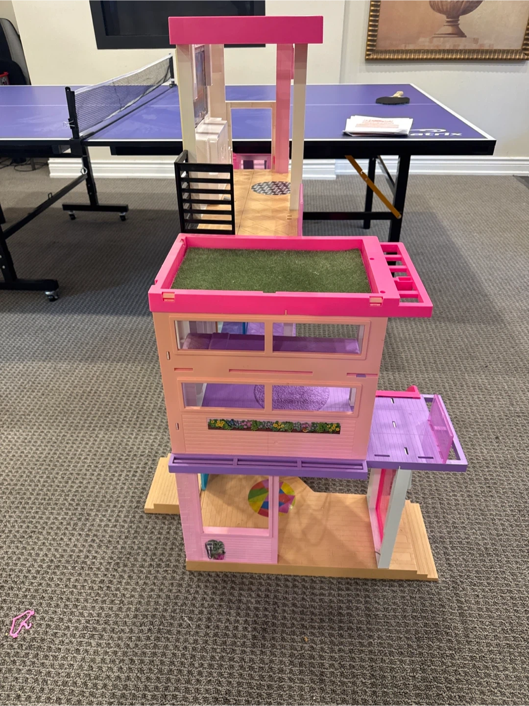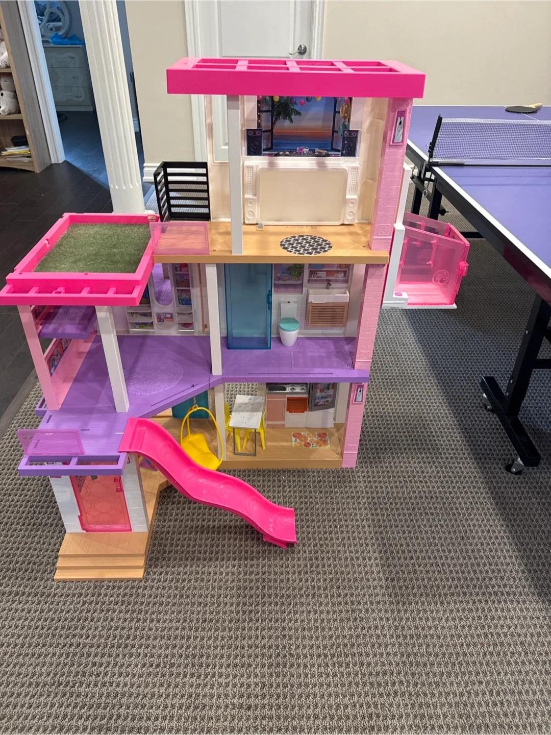 This is a Barbie Dreamhouse playset. It features multiple levels with various rooms and accessories. It includes a slide and a rooftop patio. Being sold as is not sure if prices are missing or not. Still in pretty good condition and I can deliver it with fair price increase