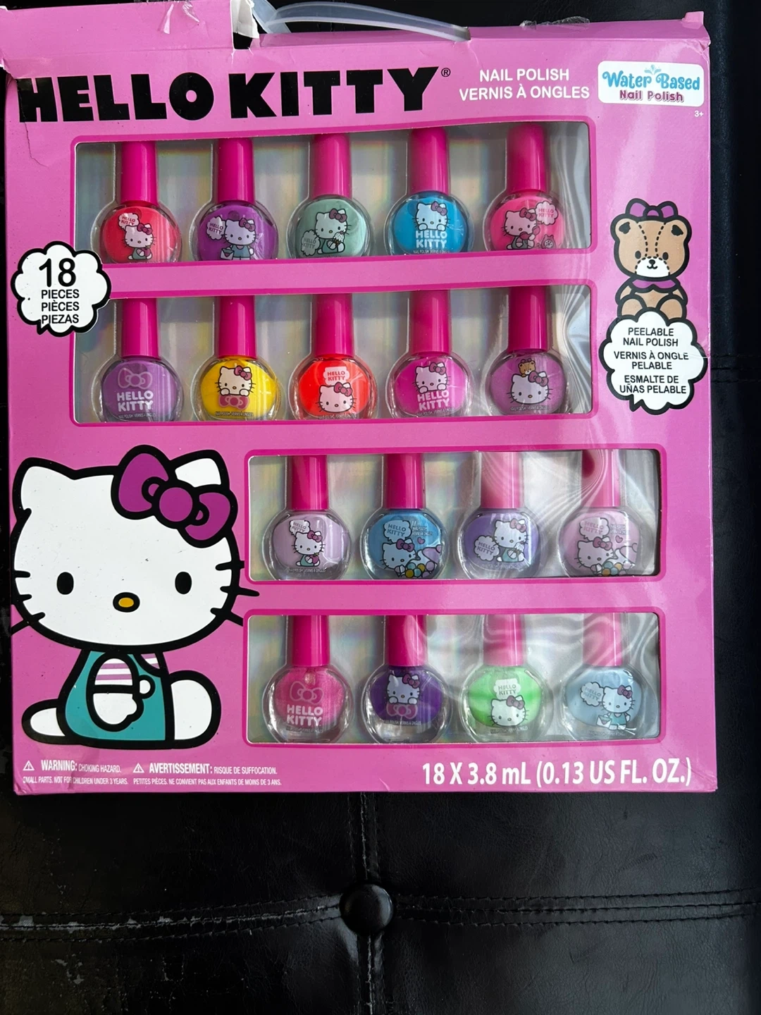 This is a Hello Kitty set featuring 18 water-based, peelable nail polishes. Each bottle contains 3.8 mL (0.13 US FL. OZ.) of polish. Suitable for ages 3 and up.