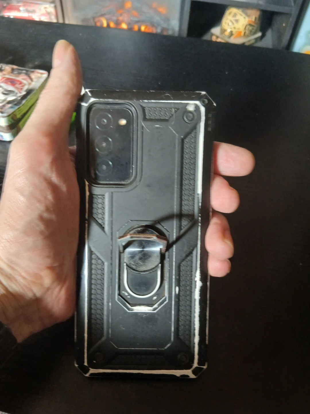Samsung Galaxy A03s unlocked smartphone in a protective case. It's powered by Android. The case includes a built-in ring stand.