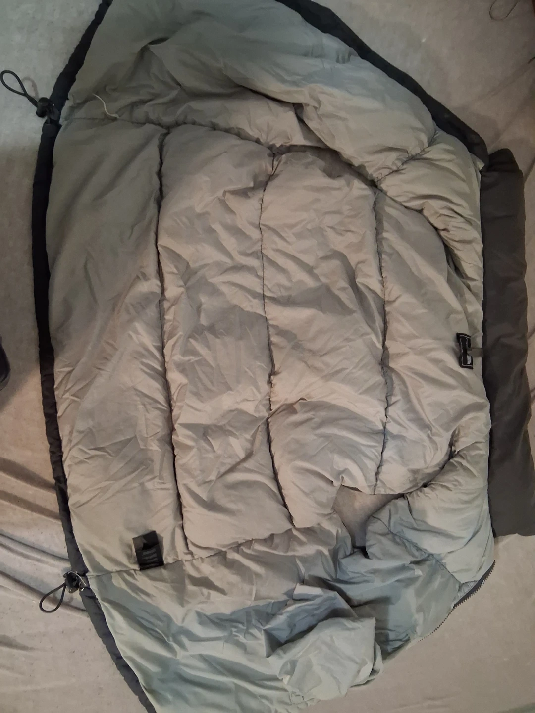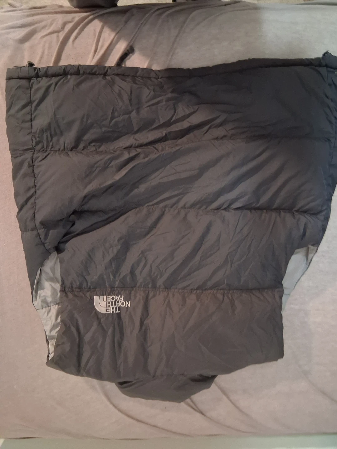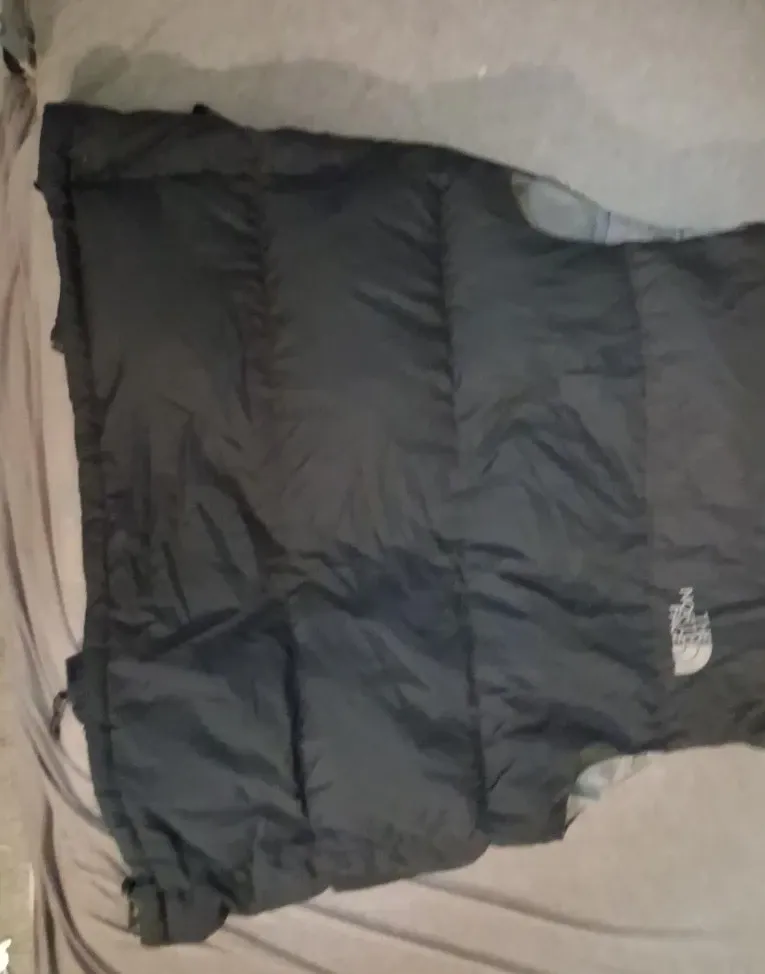 This is a The North Face puffer jacket . It's a dark grey and black colour. Great for keeping warm without having to worry about a thick jacket making you sweat.