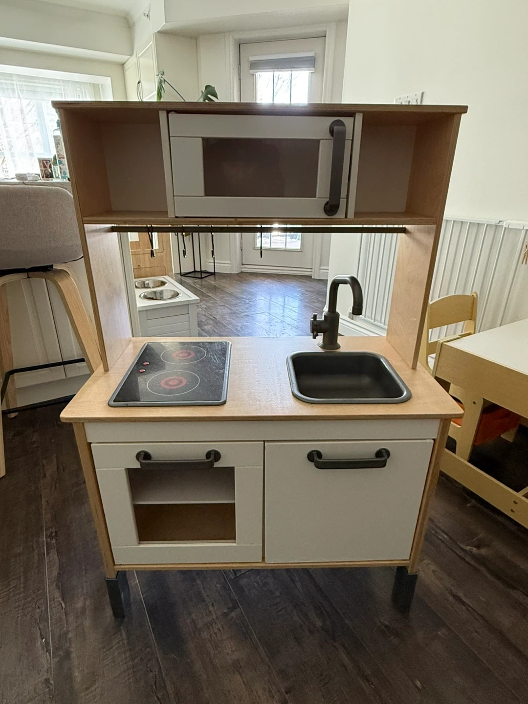 This is a used wood Montessori play kitchen for little ones. It features a microwave, a stovetop with two burners (no batteries in it), a sink with a faucet and a bar with utensil hooks. It also has cabinet storage below the counter. It's a great addition to a play area for imaginative fun! Used for 1 year.