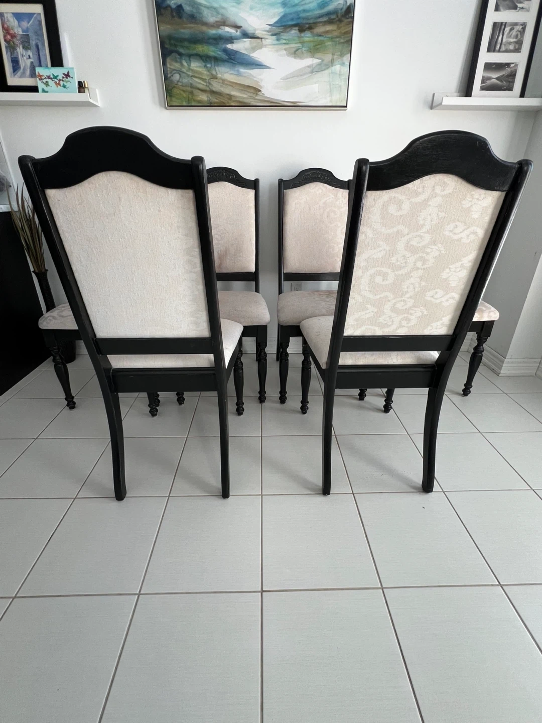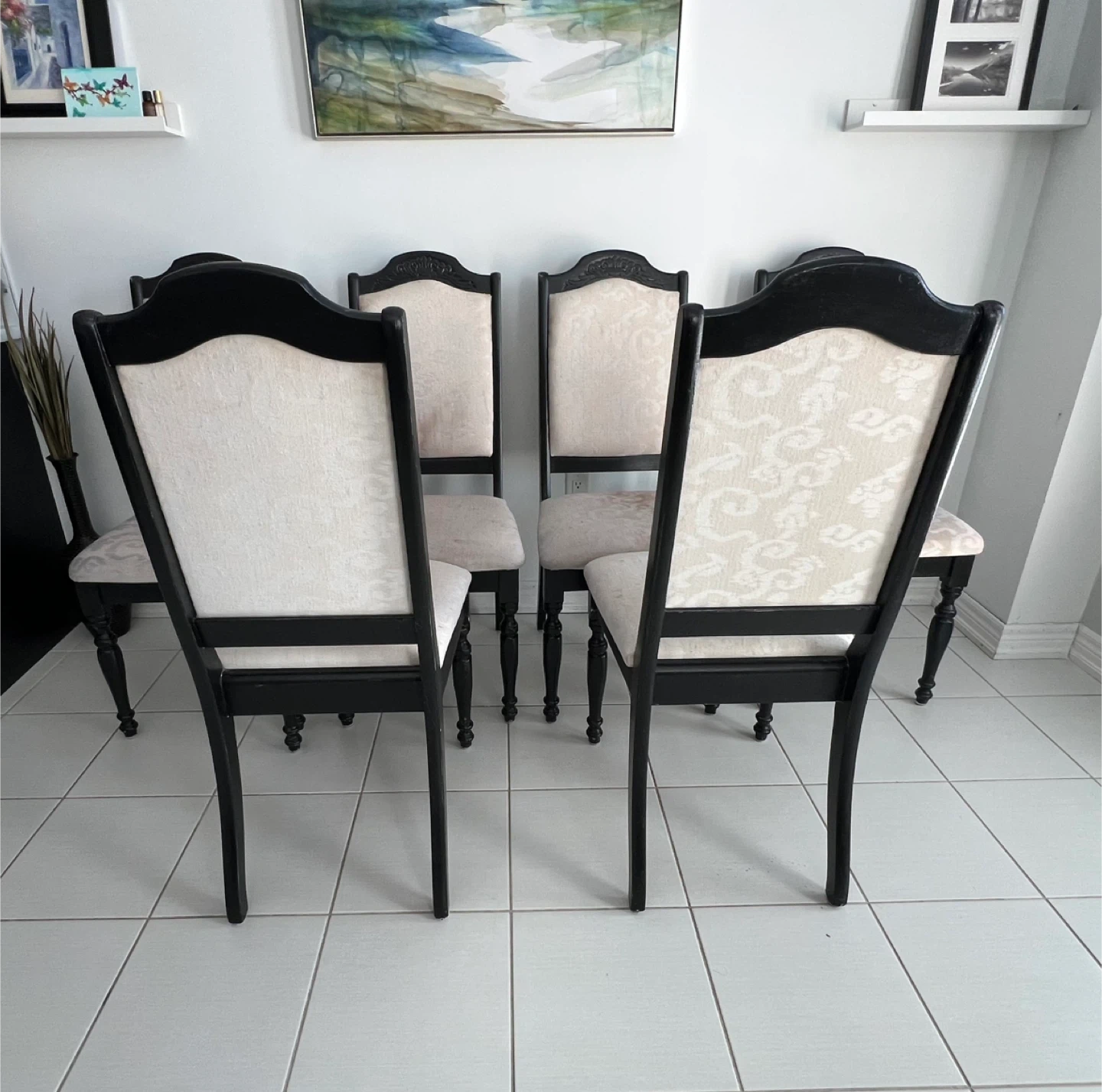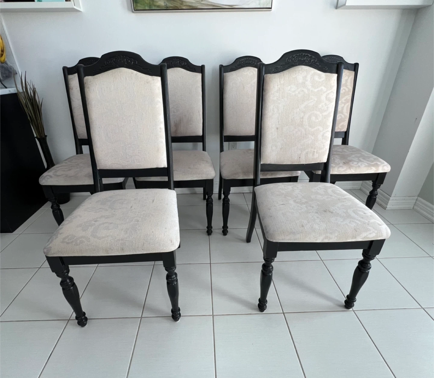 $35 each. 6 chairs available. Cushion material needs to be either professionally cleaned or upholstered.
