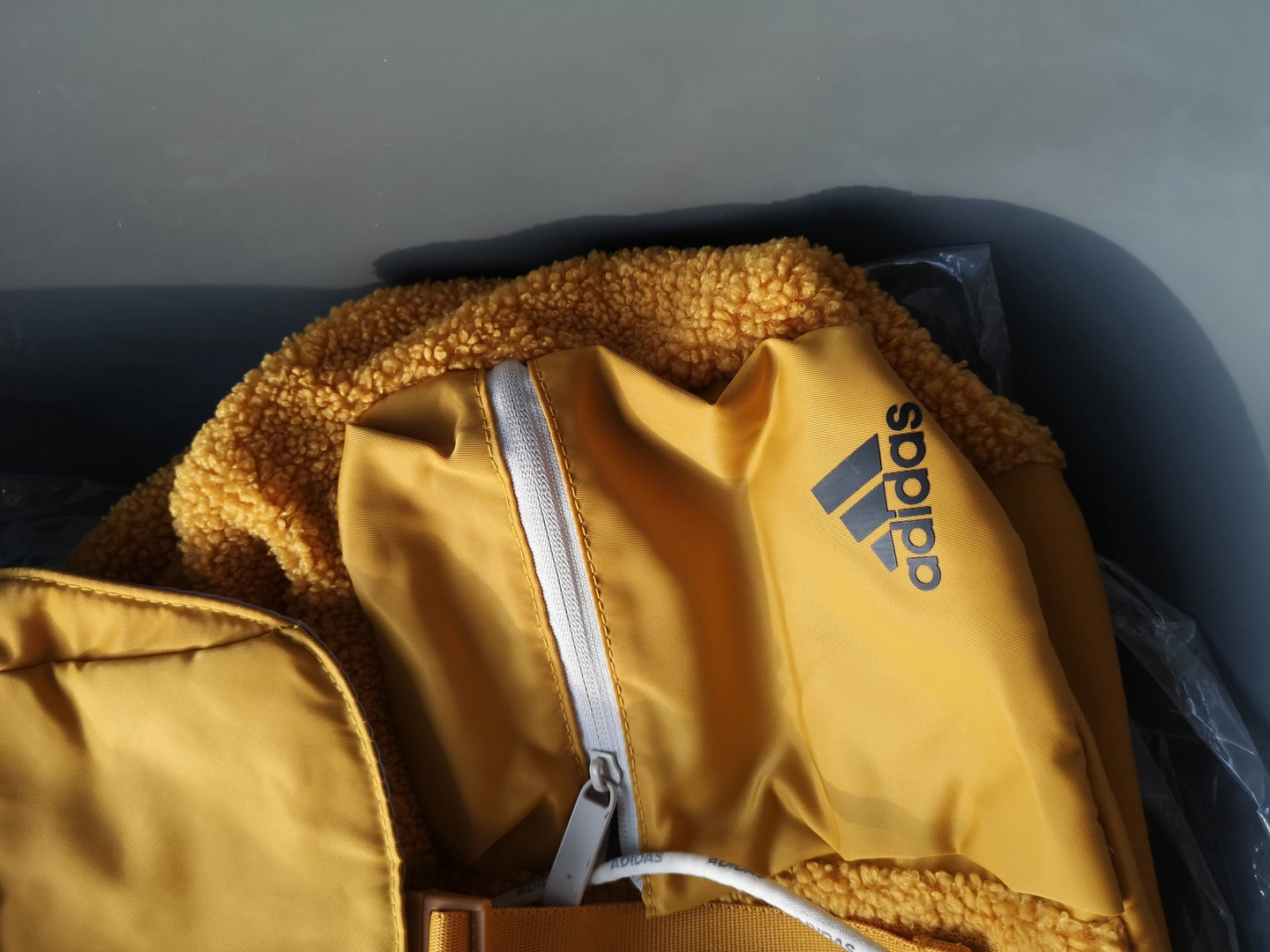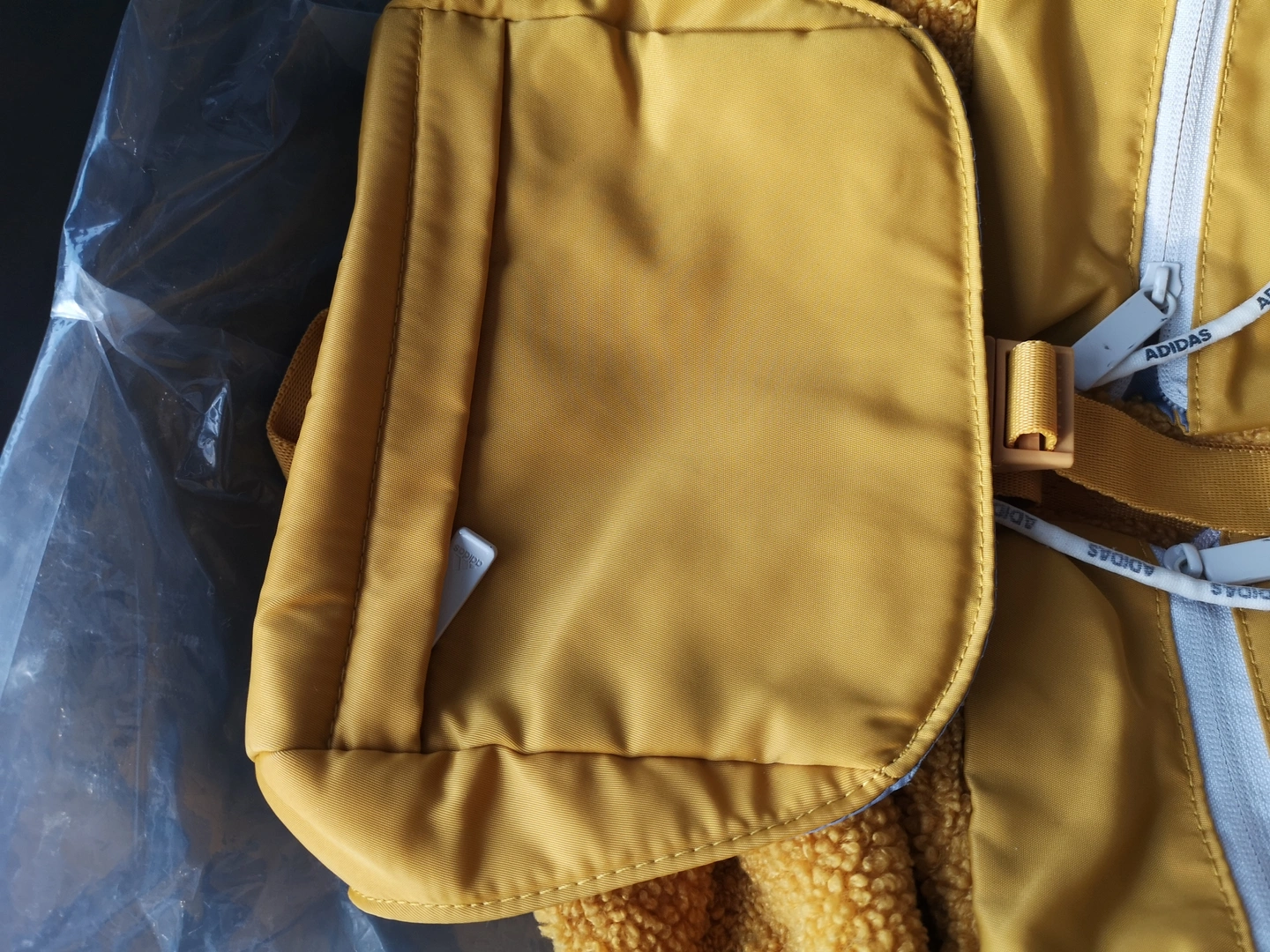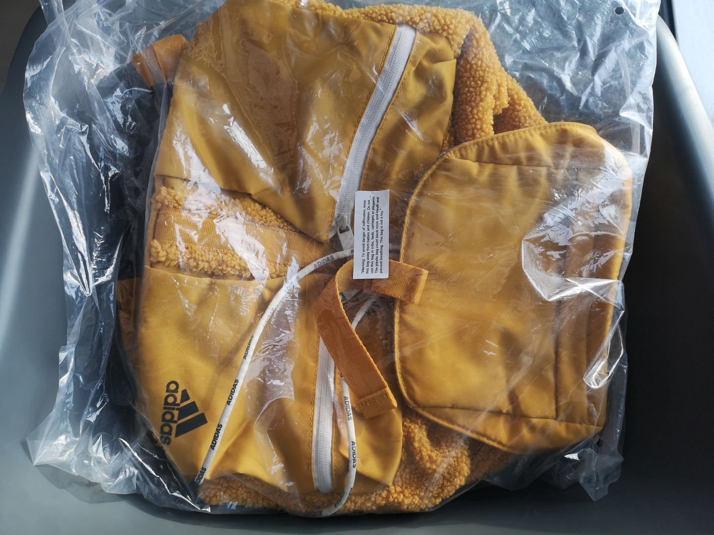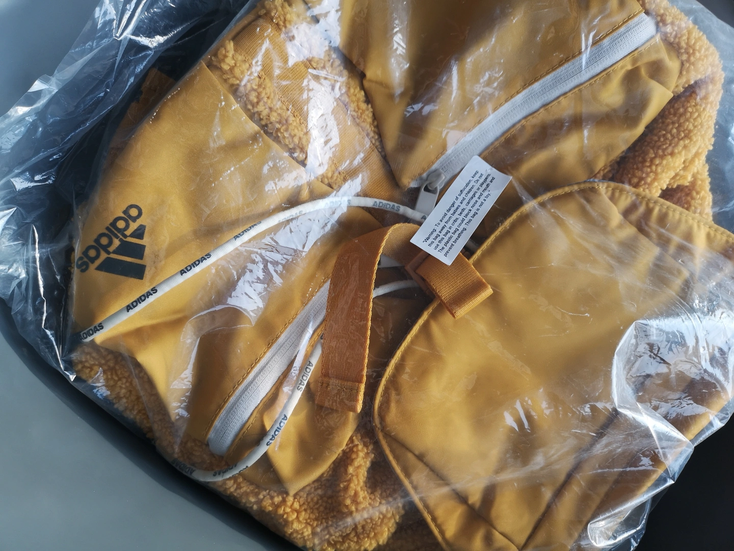 This is an Adidas sherpa fleece backpack in a vibrant yellow colour! It's a stylish and functional bag that's perfect for everyday use or outdoor adventures. The sherpa fleece lining adds a cozy touch, making it a unique and eye-catching accessory