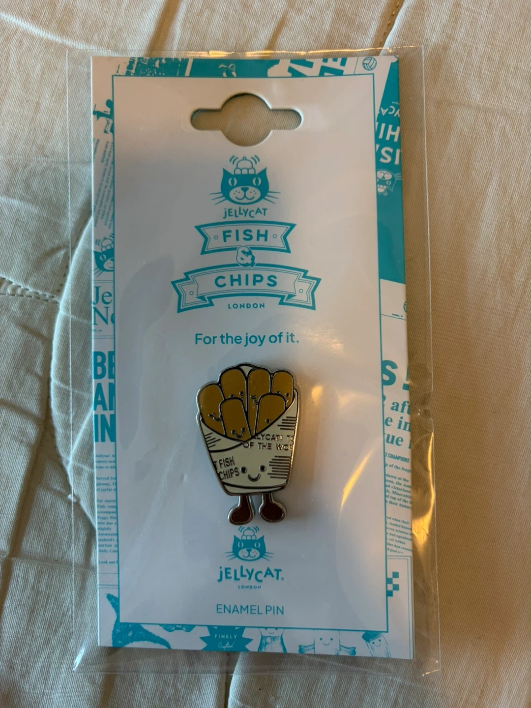 This is a Jellycat brand enamel pin featuring a cute chips design. It's from their London collection, perfect for adding a bit of fun to your gear! Finely crafted for the joy of it.