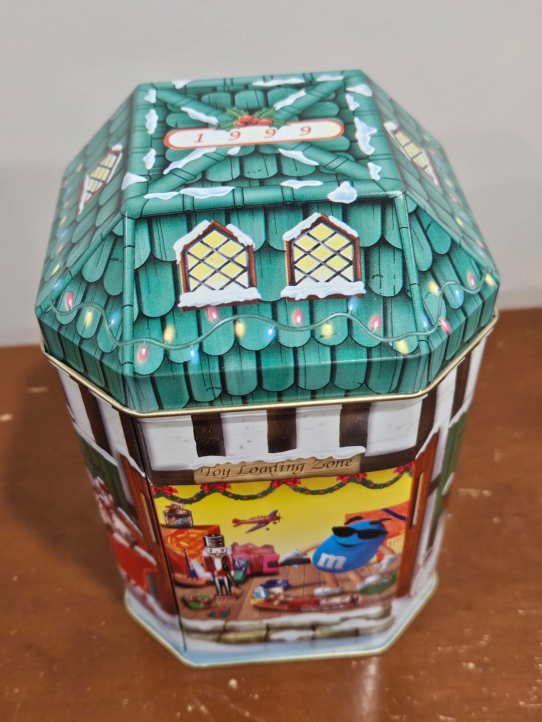 - M&M’s Collectible Christmas Tin 5: 1999, Christmas Village Series #10 Santa’s Workshop