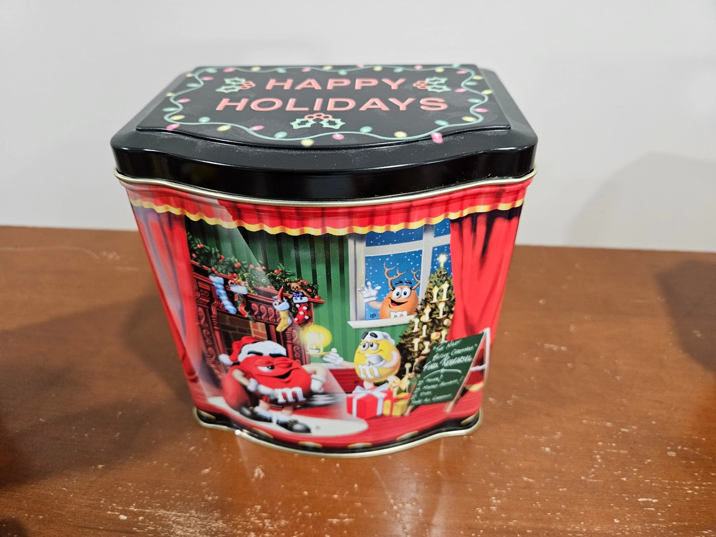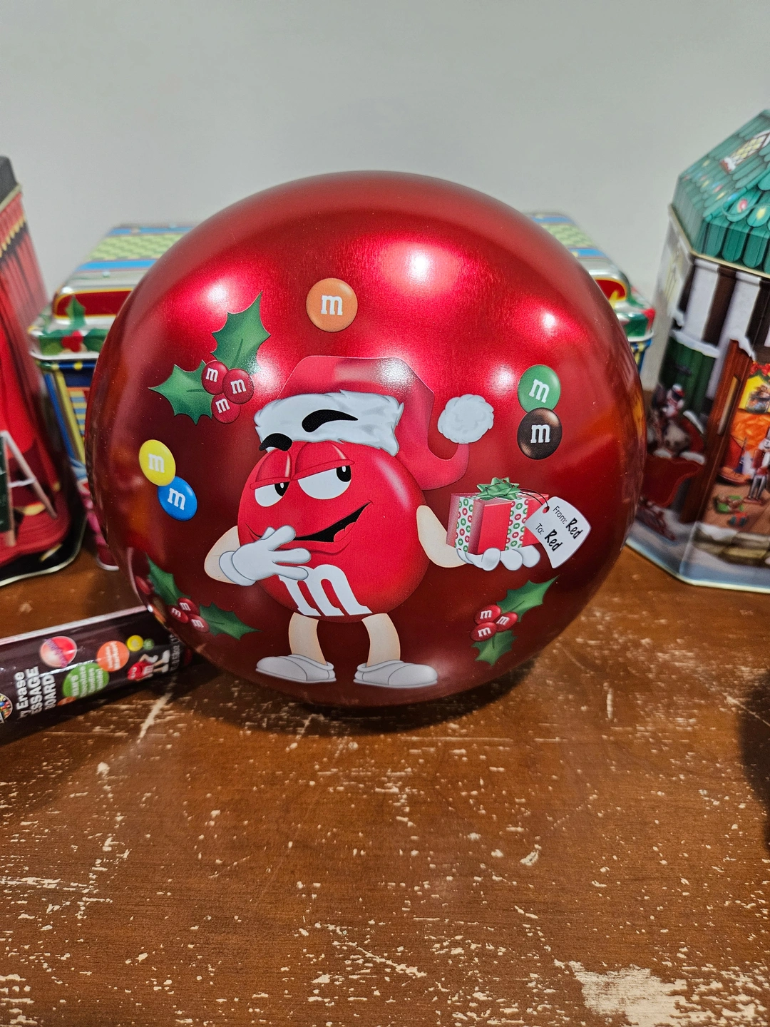 - M&M’s Collectible Christmas Tin 6: 2011, M&M Shaped Red Round Metal Container with Lid