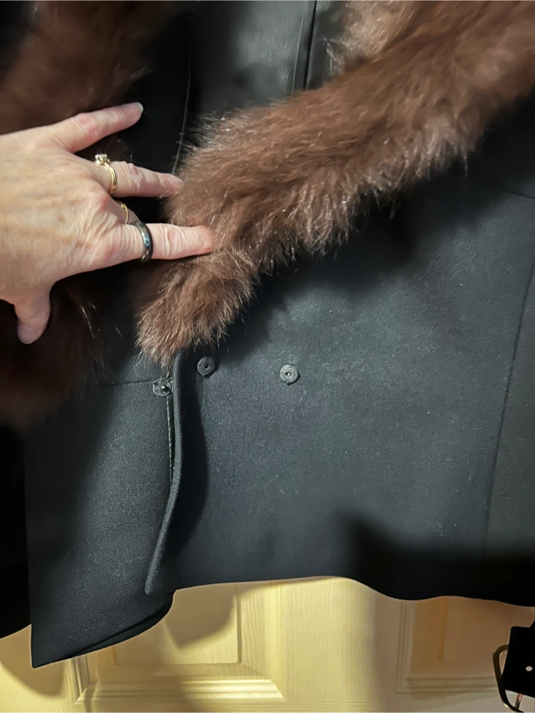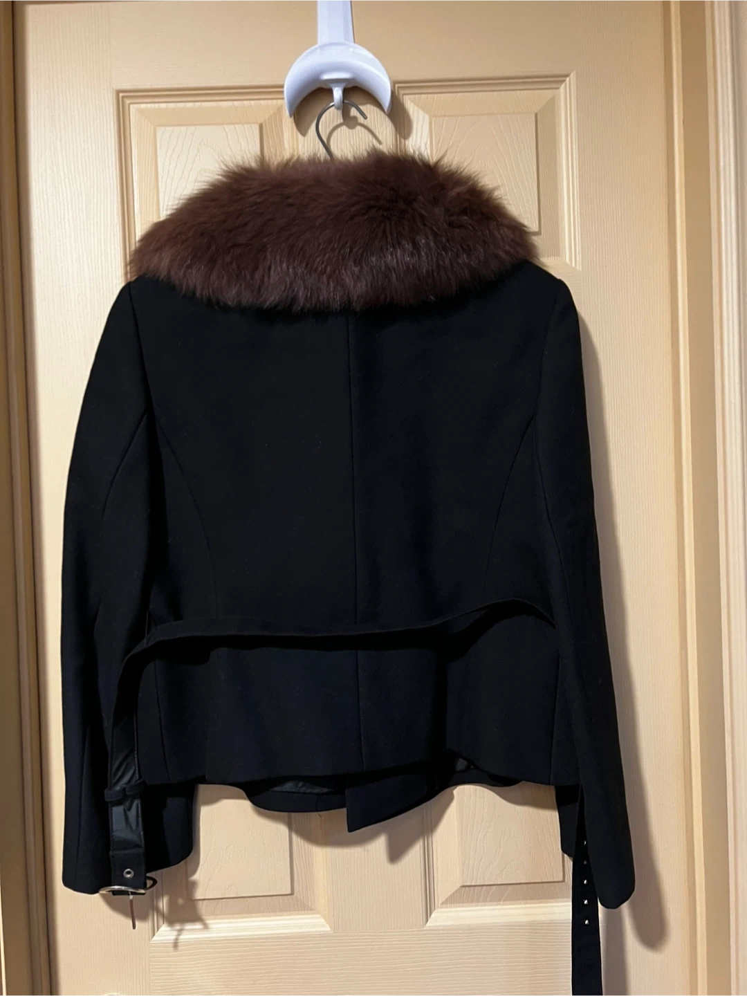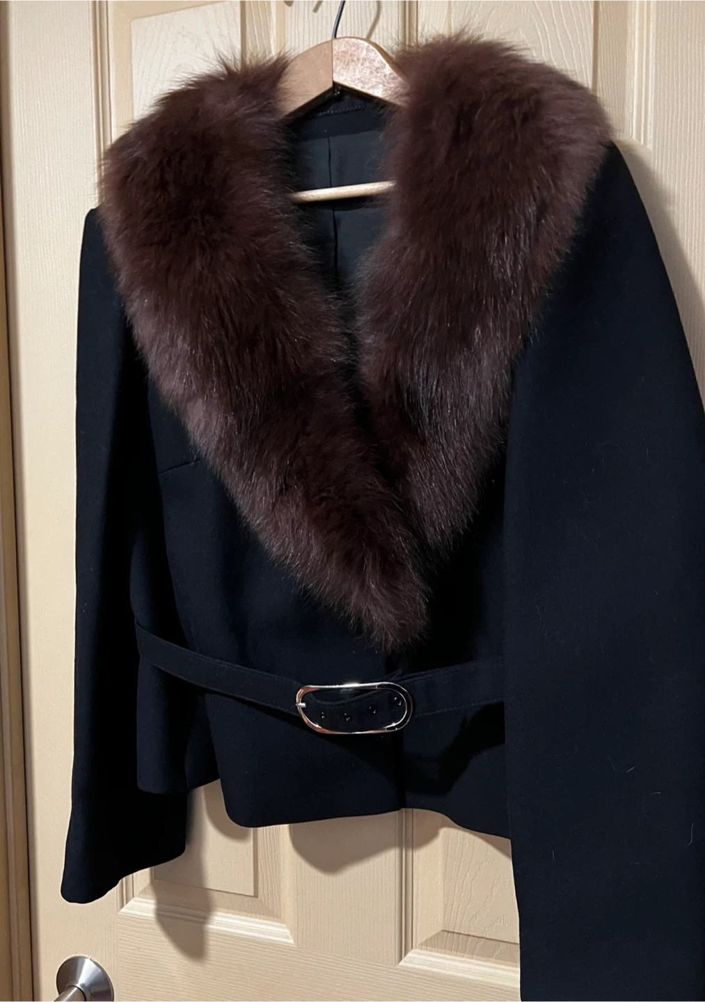 This elegant Horst Mandel jacket is crafted from pure new wool and features a detachable fur collar. It's fully lined with 100% viscose. The belted waist offers a flattering silhouette. Size is a medium, barely worn maybe once or twice.