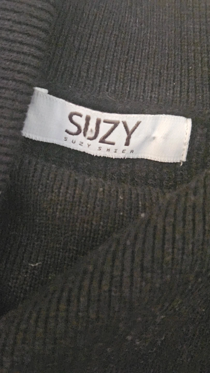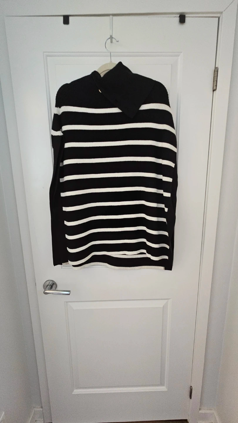 Beautiful Poncho Sweater by Suzy Shier sweater in a size Medium. It features a black and white stripe pattern with gold-toned buttons on the side and neckline. Opens both slightly or fully on the side, with beautiful gold buttons to close the side. Stylish and versatile, perfect for work, evening or everyday wear. Virtually brand new.