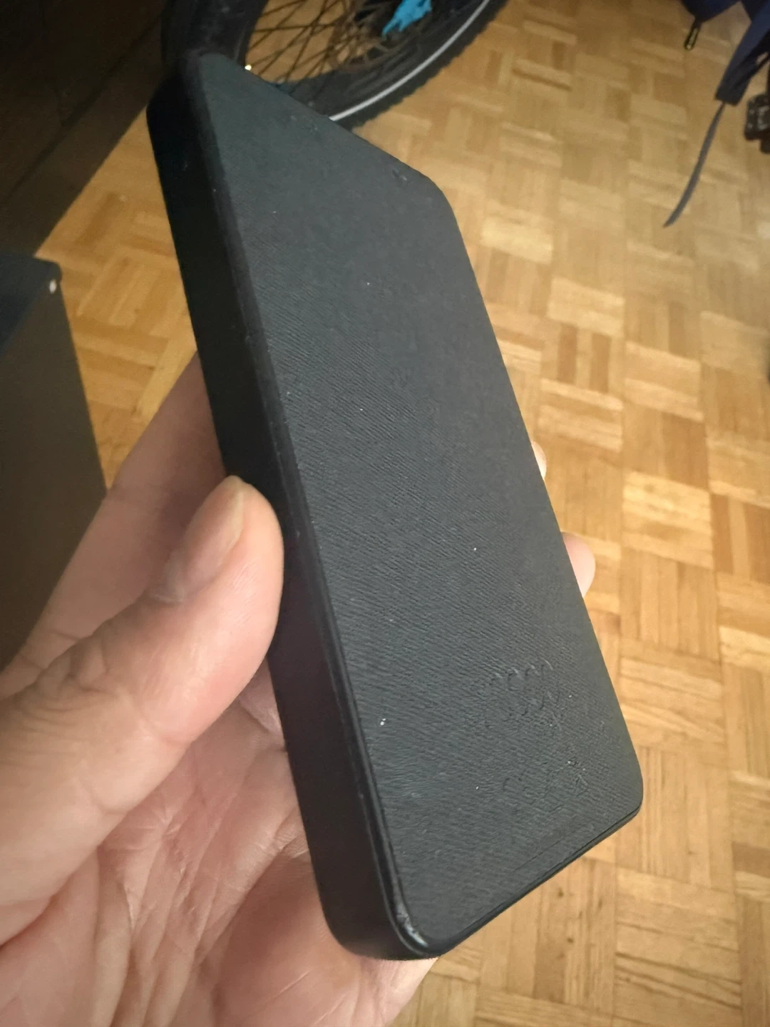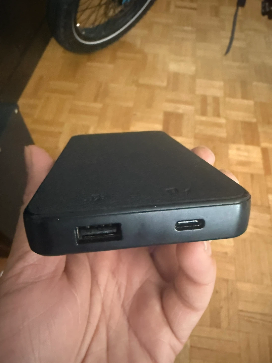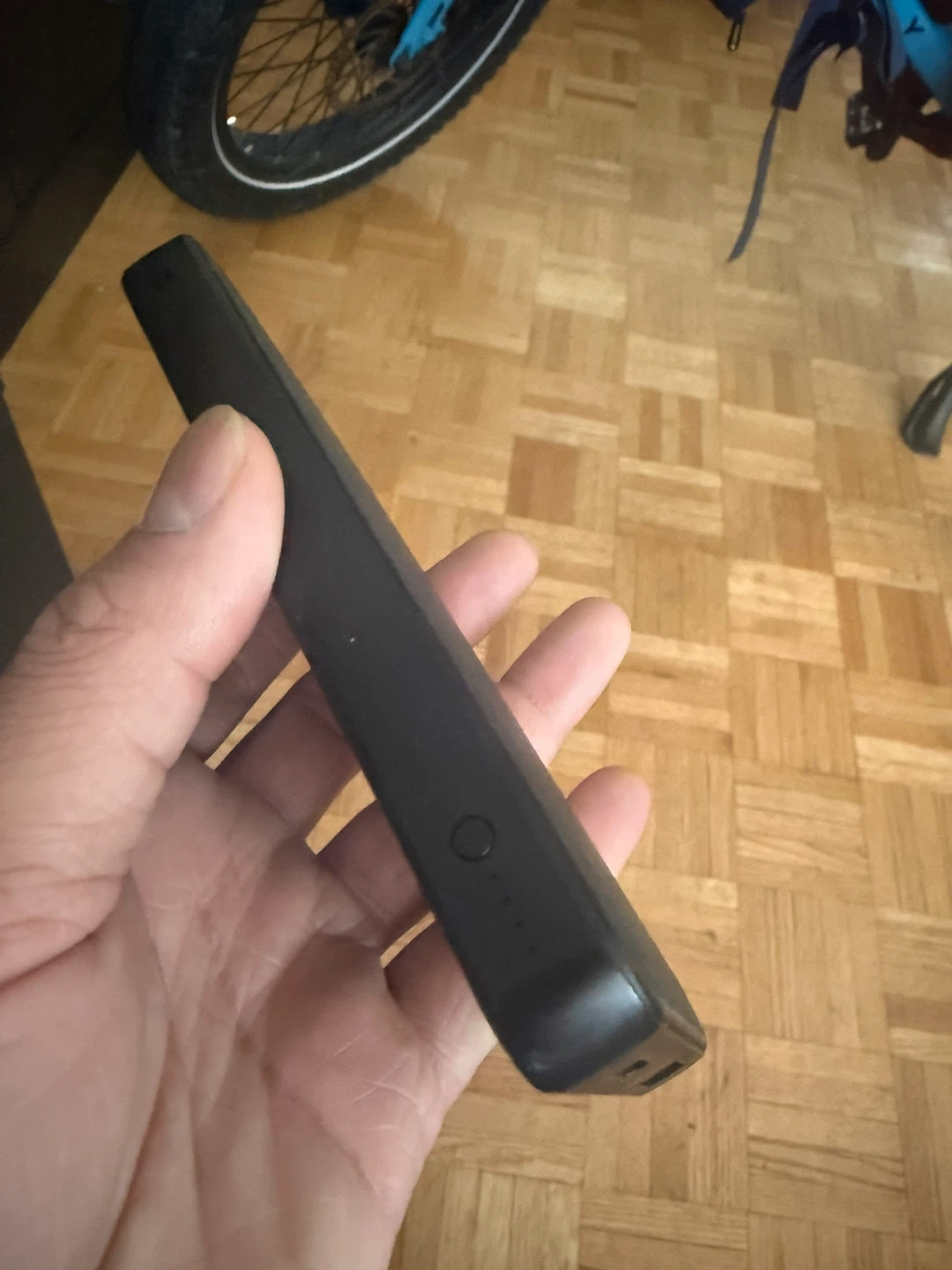 This is an Anker PowerCore portable charger with a 10000 mAh capacity. It's black and made of plastic. It included a USB-C input and USB-A output.