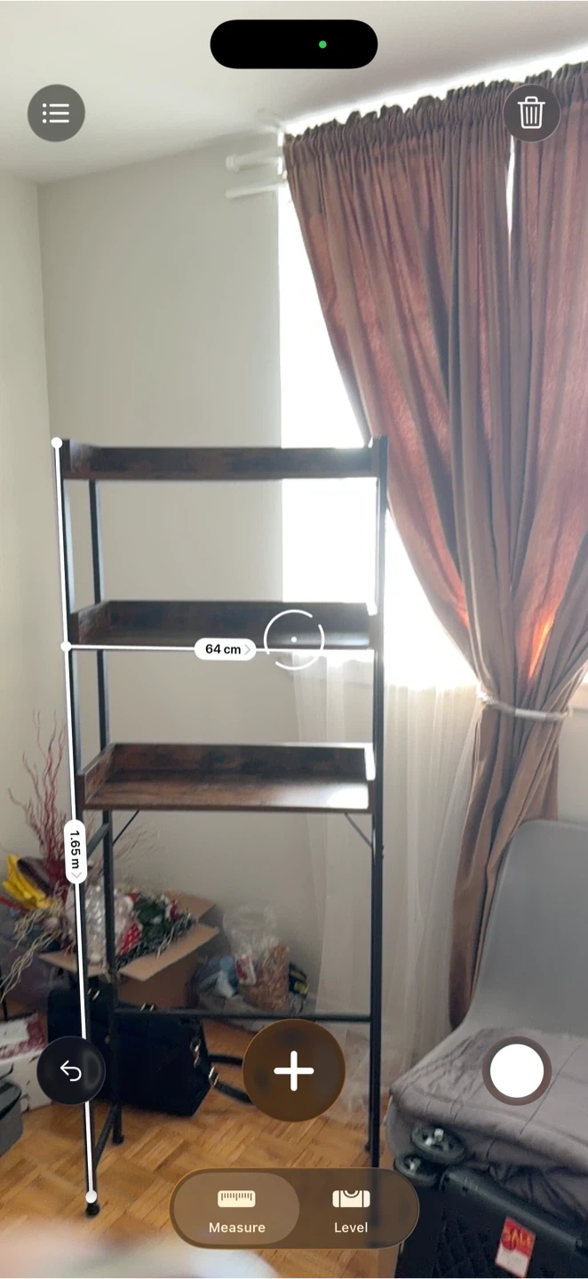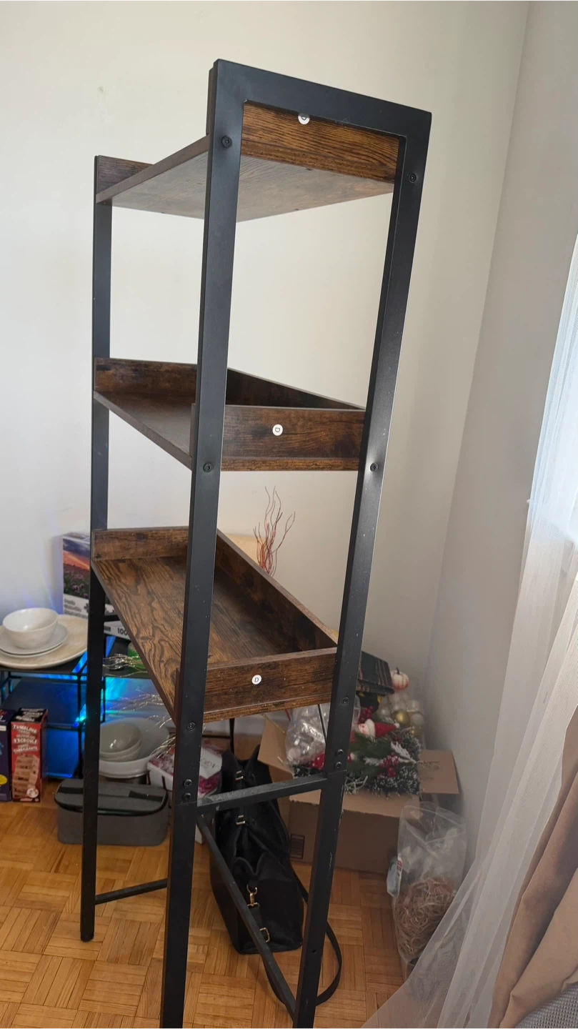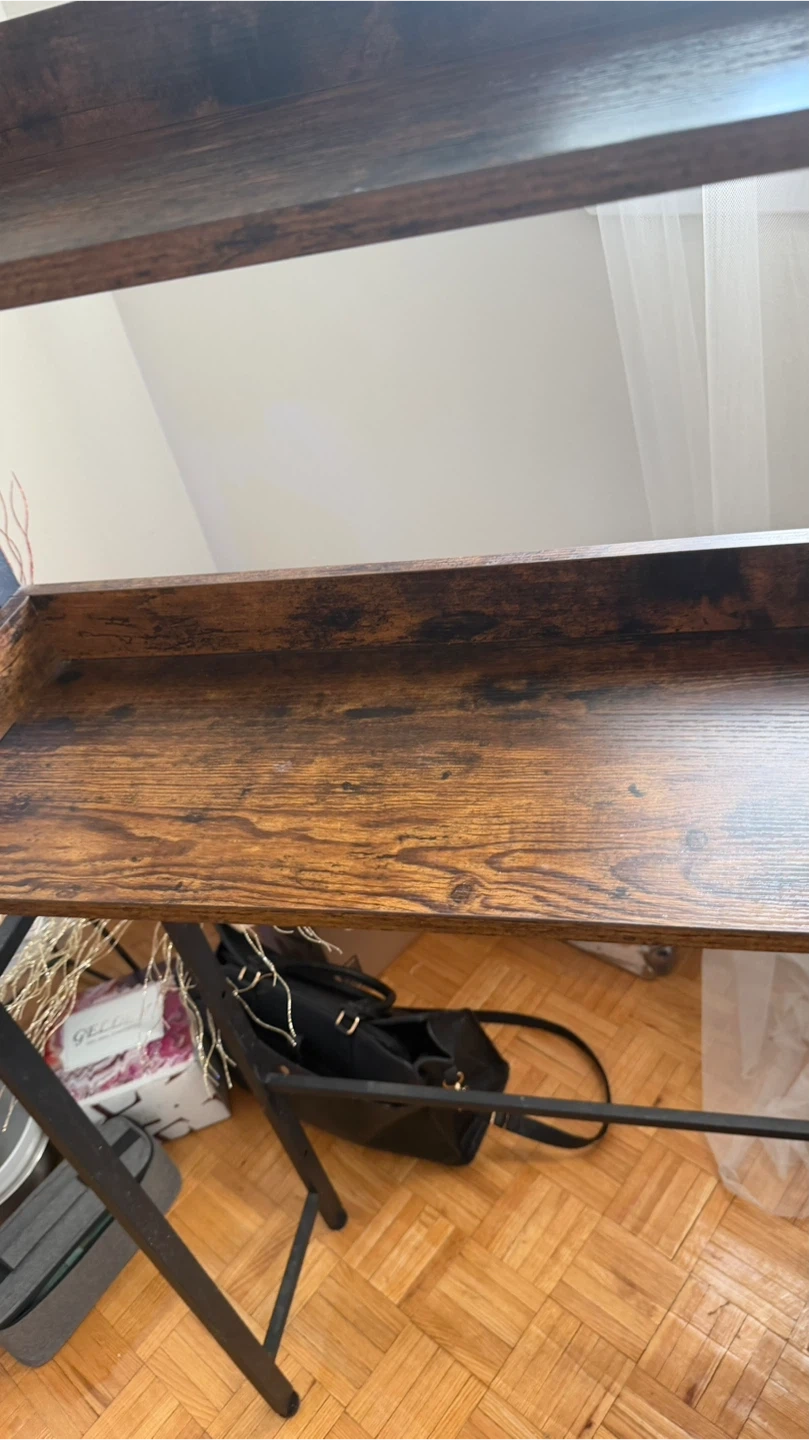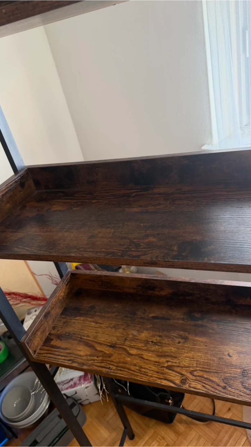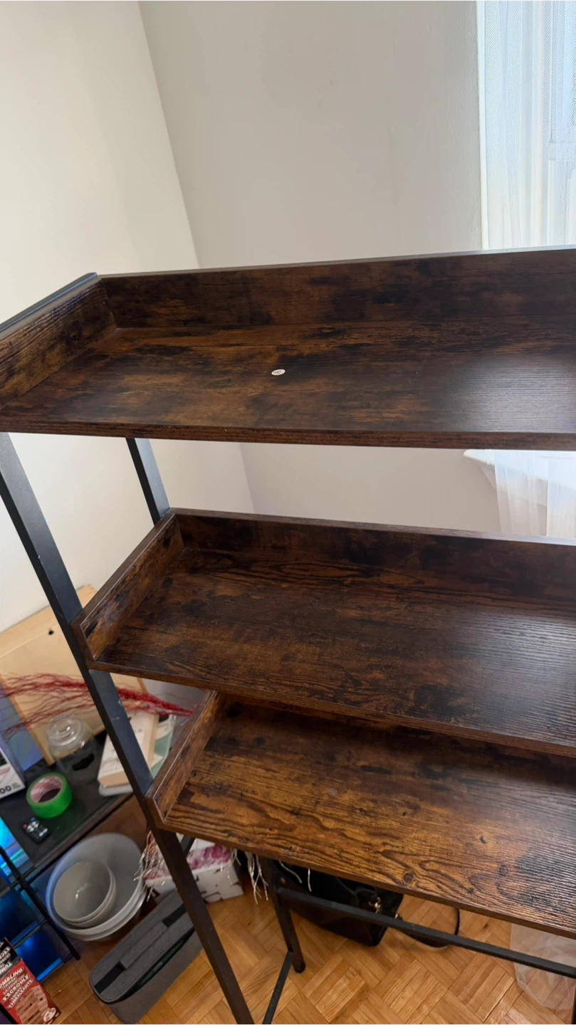 This is a rustic brown ladder shelf with a metal frame. It has three tiers for storage or display. It's a stylish and functional piece for any room!