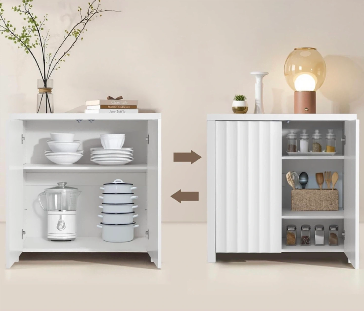 This white Finnihomy side table has a modern design with fluted doors. It's made of MDF and features three shelves, each adjustable to three height options. The tabletop is thickened and the legs are widened for stability.