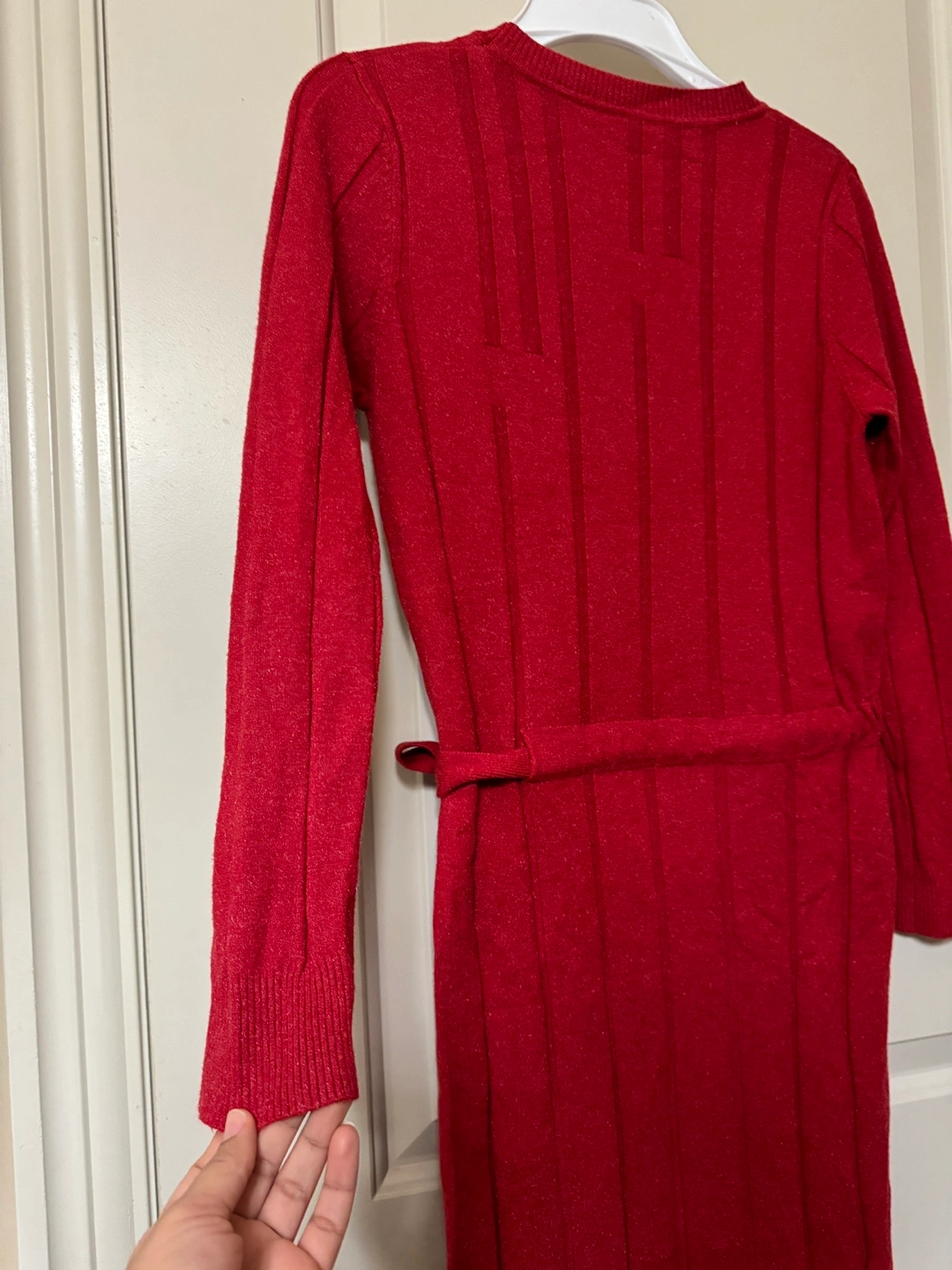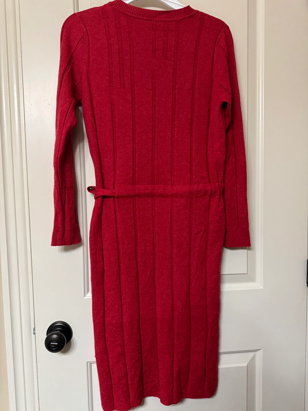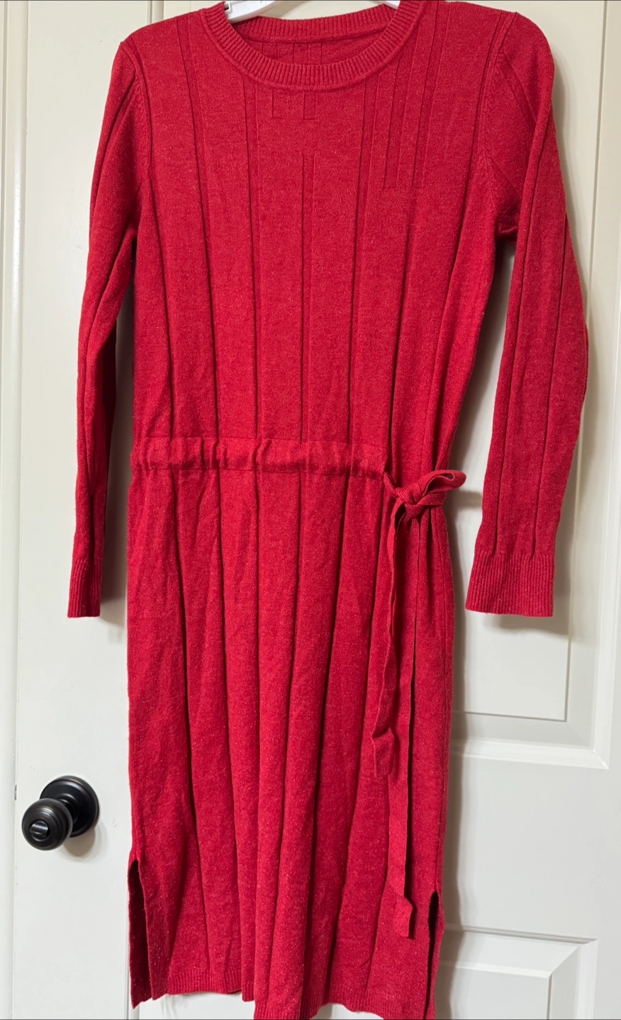 Wore 3 times only. Red knit sweater dress with long sleeves and a tie waist. It has a ribbed texture down the front and back.
