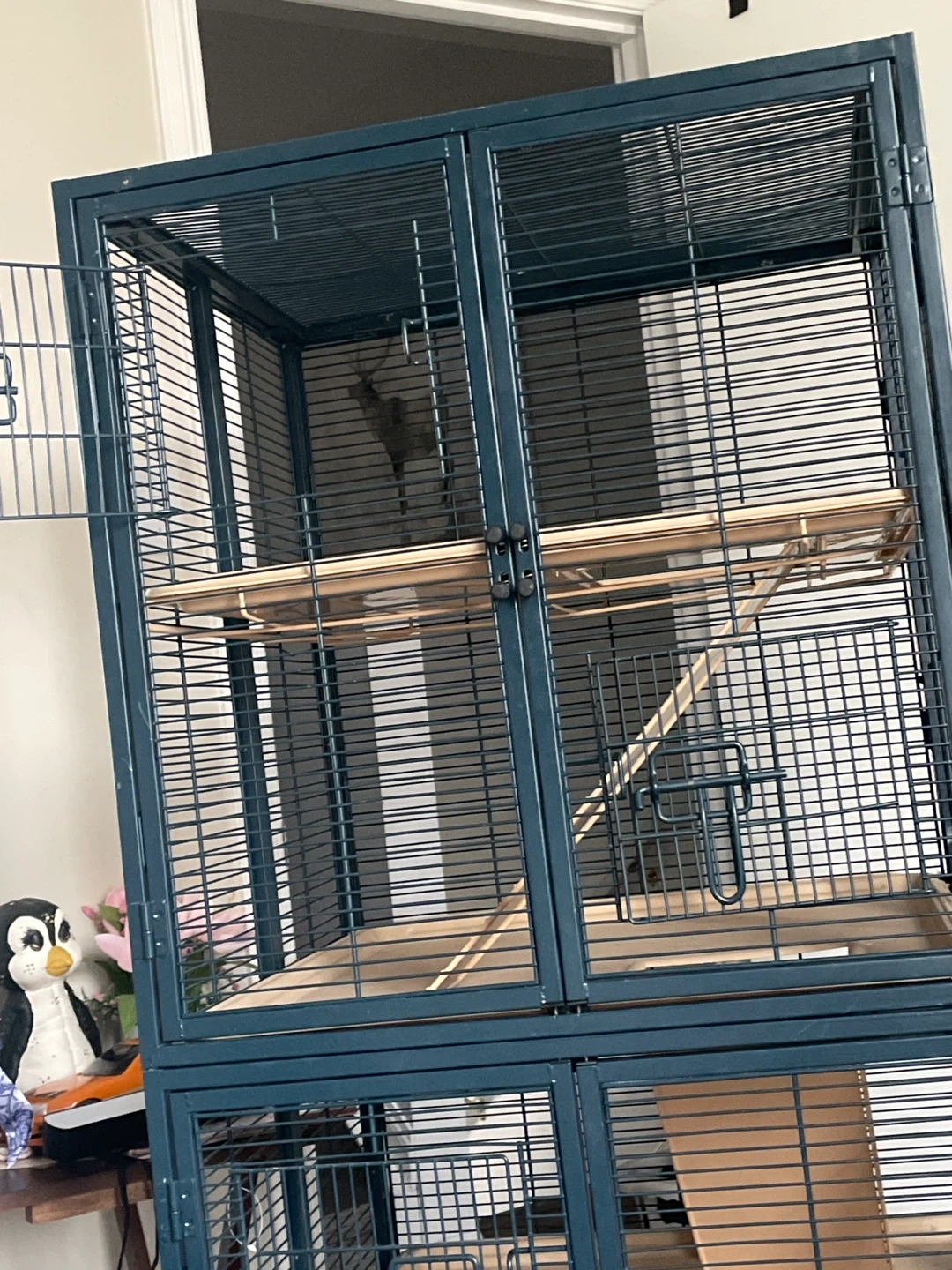 This is a spacious multi-level pet cage, perfect for small animals like hamsters or chinchillas. It comes with multiple wooden shelves and ramps for enrichment. The cage is constructed from durable metal and features several doors for easy access and cleaning.