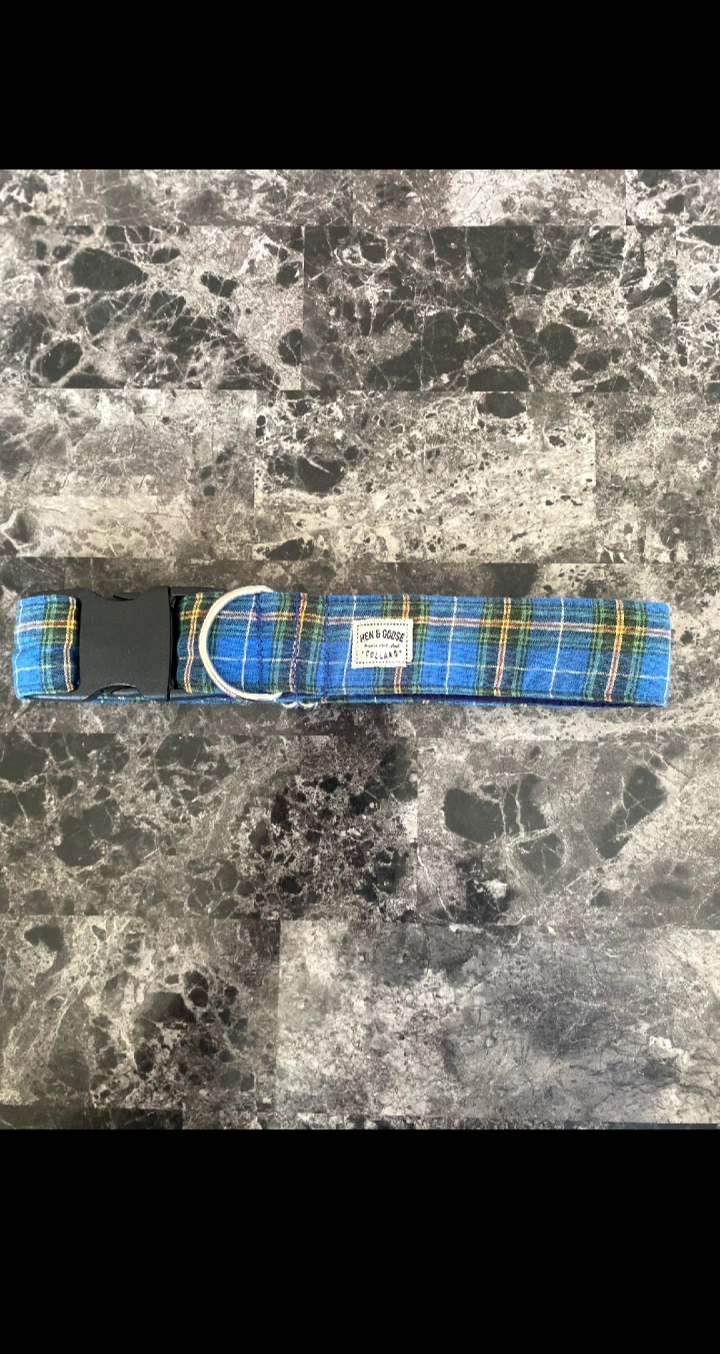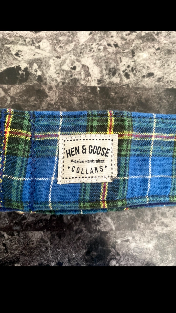This Hen & Goose dog collar features a blue plaid pattern. It's a premium handcrafted item with a secure buckle closure.