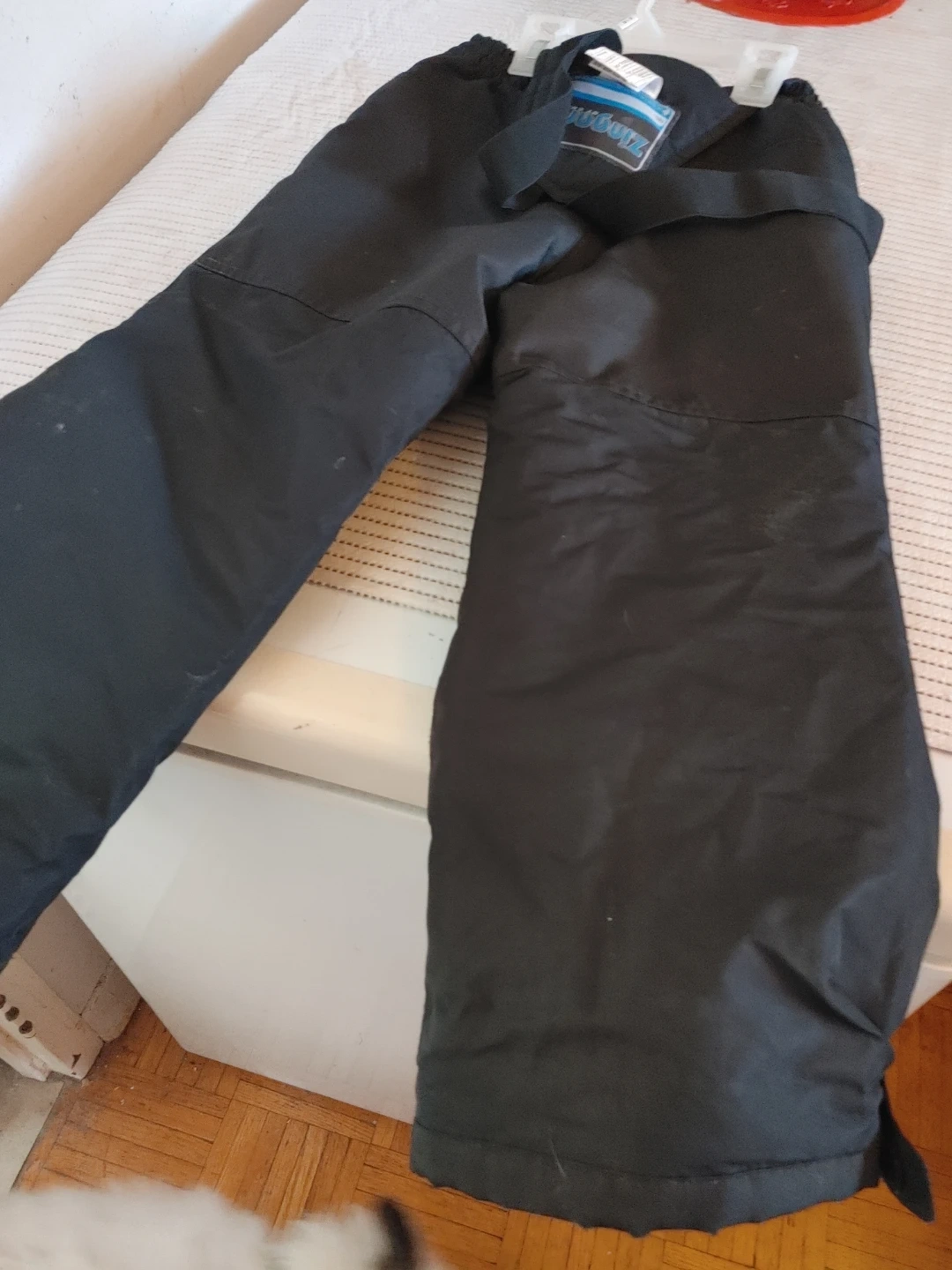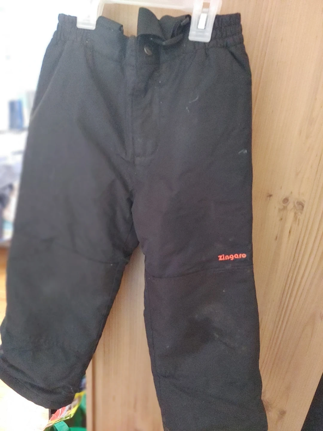 This is a Zingaro kids winter jacket and snow pants set. The jacket has a bold orange, black, and grey abstract pattern with reflective accents. Both pieces are black. Perfect for keeping warm during cold weather activities!