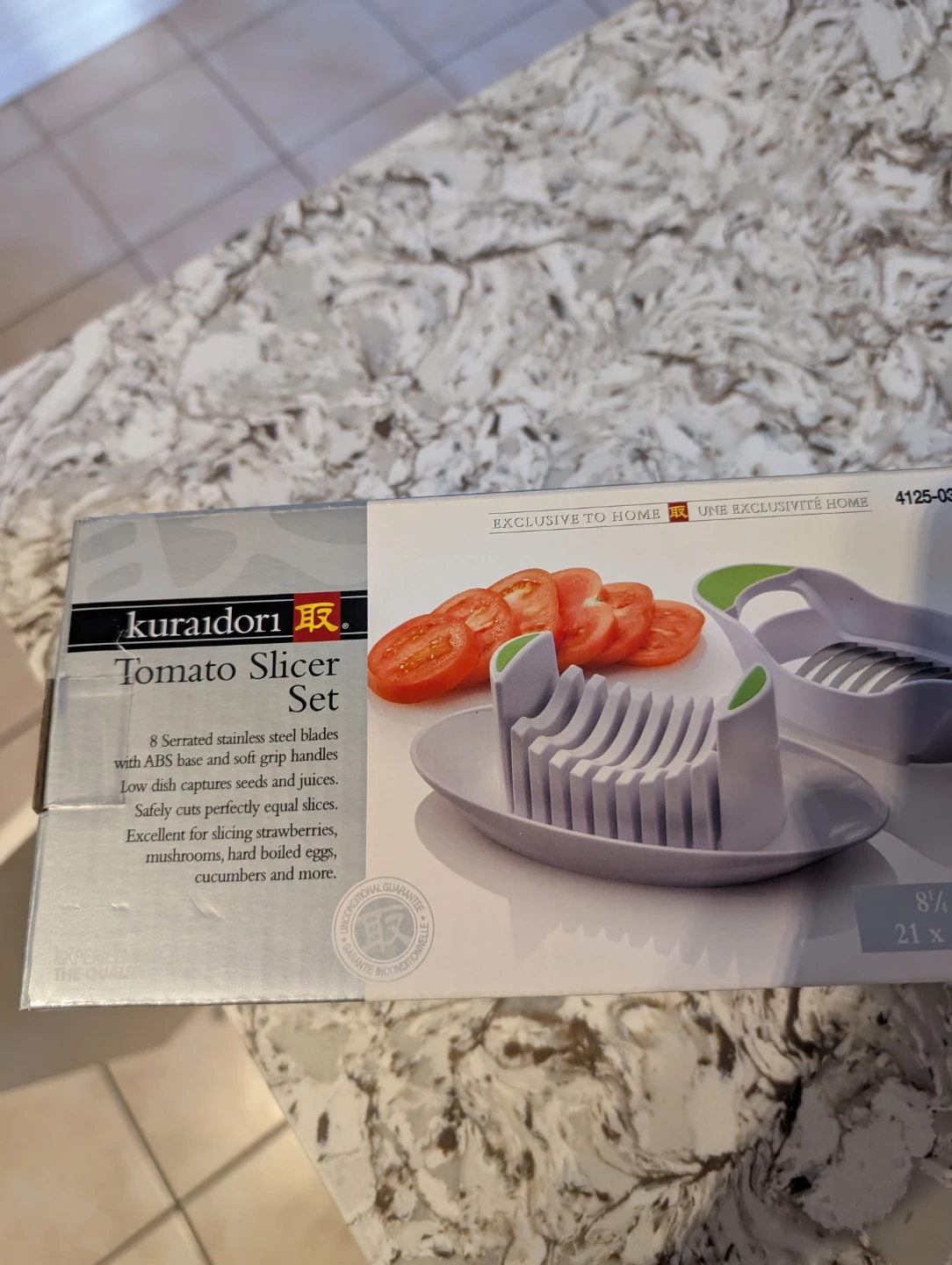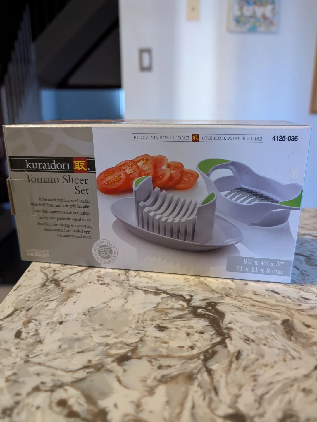 This KuraiDori Tomato Slicer Set features 8 serrated stainless steel blades with ABS base and soft grip handles. Low dish captures seeds and juices. Safely cuts perfectly equal slices. It's excellent for slicing strawberries, mushrooms, hard-boiled eggs, cucumbers and more!