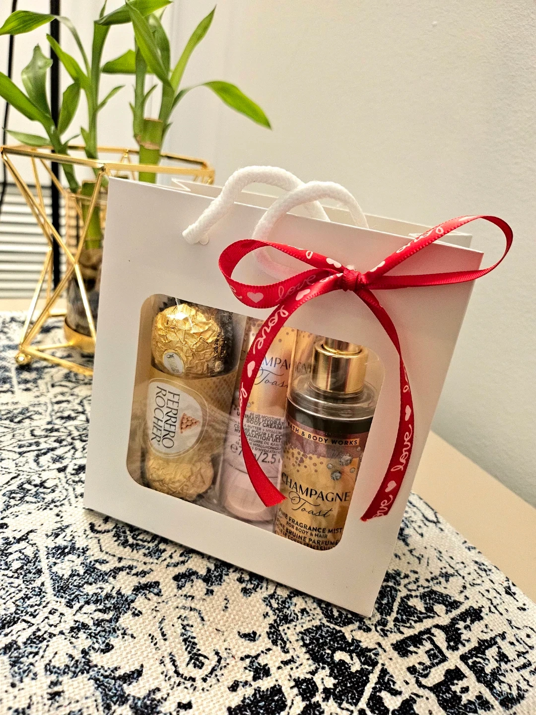 This cute gift set has Bath & Body Works Mini Champagne Toast body cream and fine fragrance mist. Also comes with a pack of Ferrero Rocher chocolates. All new, ready for a little treat or small gift.