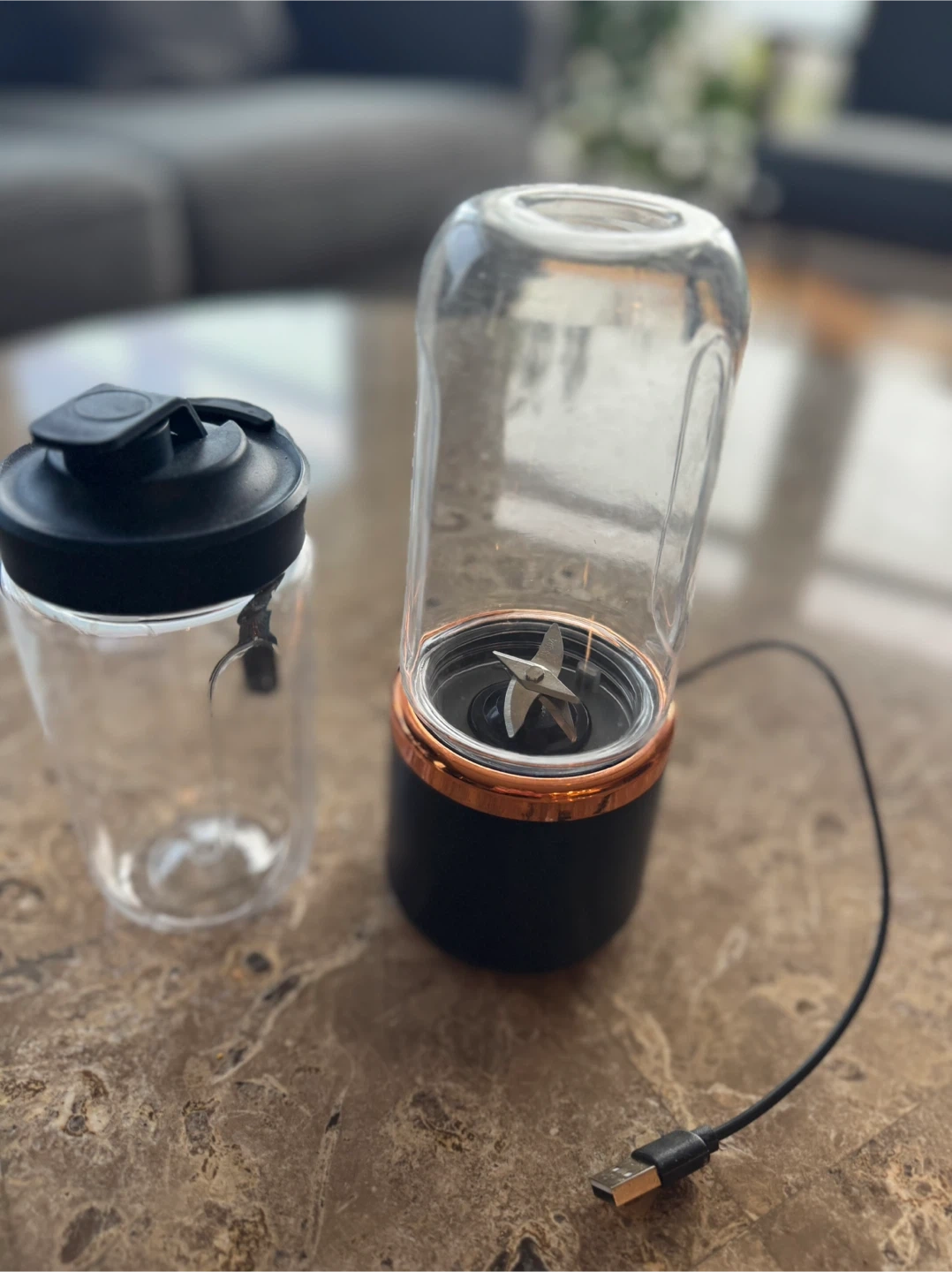 This portable blender comes with a USB charging cable. It's great for making smoothies on the go. The plastic cup is durable and easy to clean.