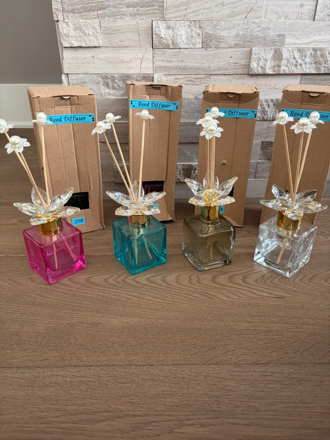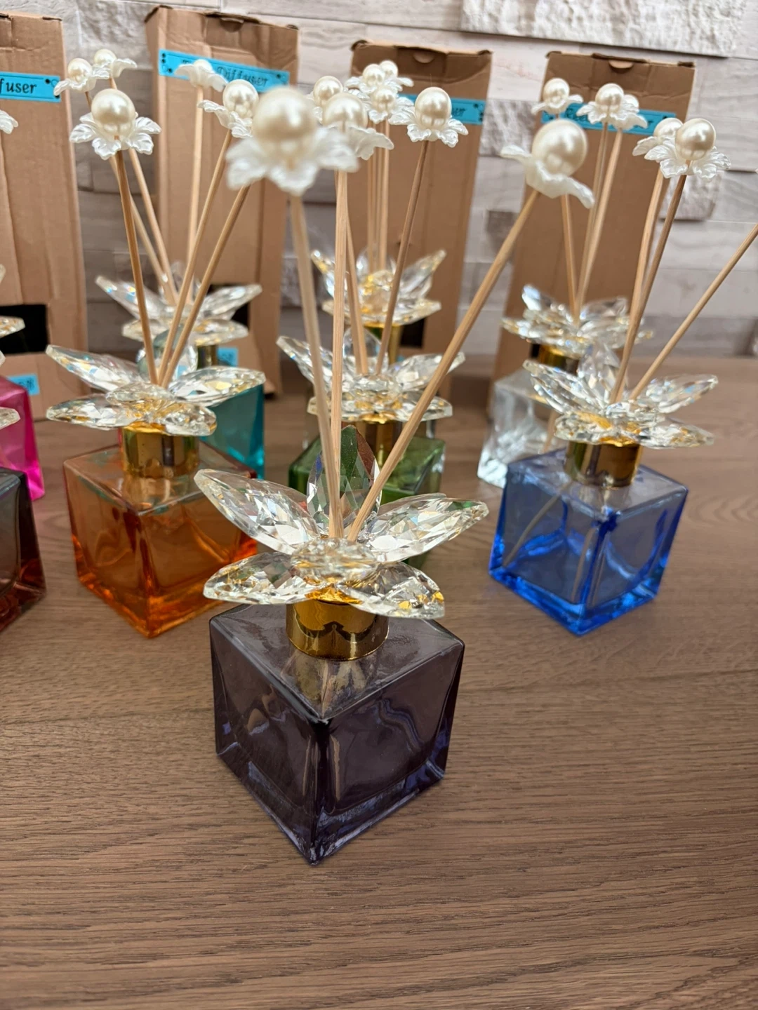 Add a touch of elegance to any room . Each diffuser features a colourful glass bottle with a decorative crystal flower and pearl topper. Includes reeds for fragrance dispersal. Bottles come in assorted colours: pink, teal, orange, green, blue, purple, and clear.(9 different colours )