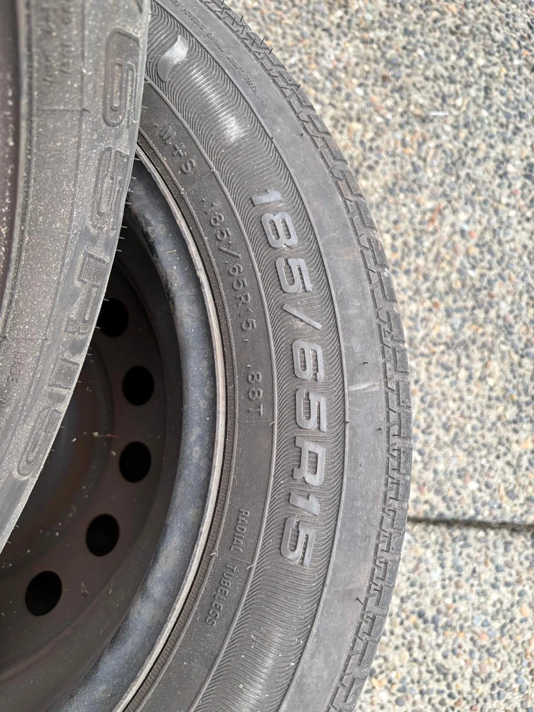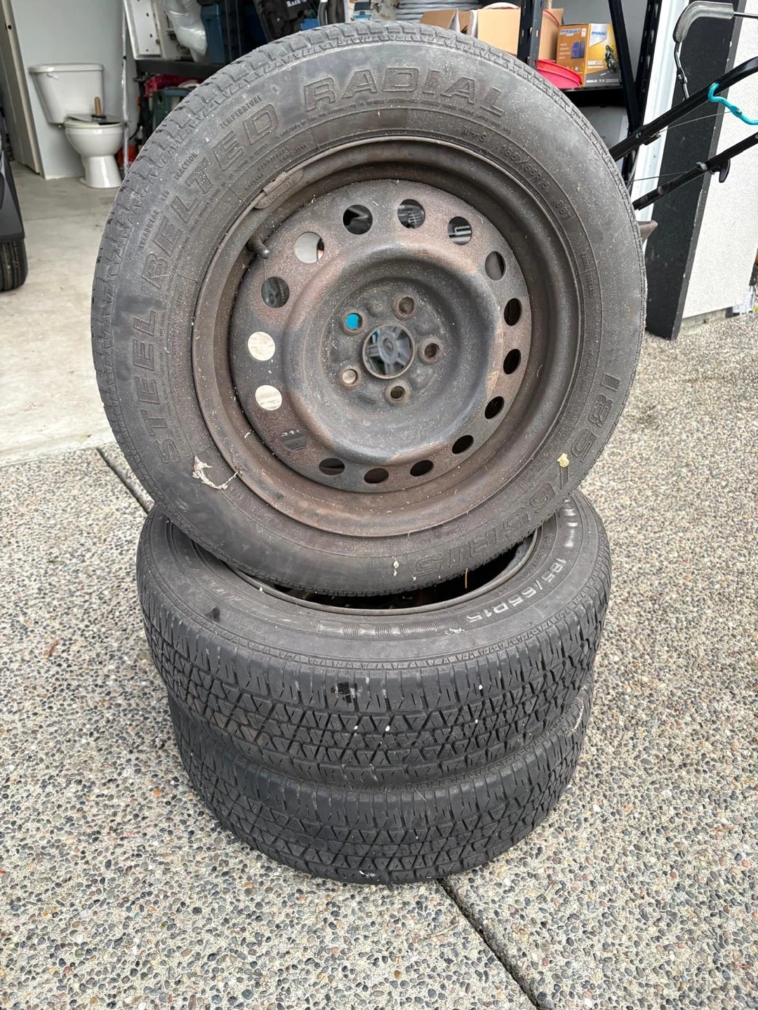 Four used tires are included, each sized 185/65R15, mounted on steel rims. These are radial tubeless tires. They're ready for a new vehicle.