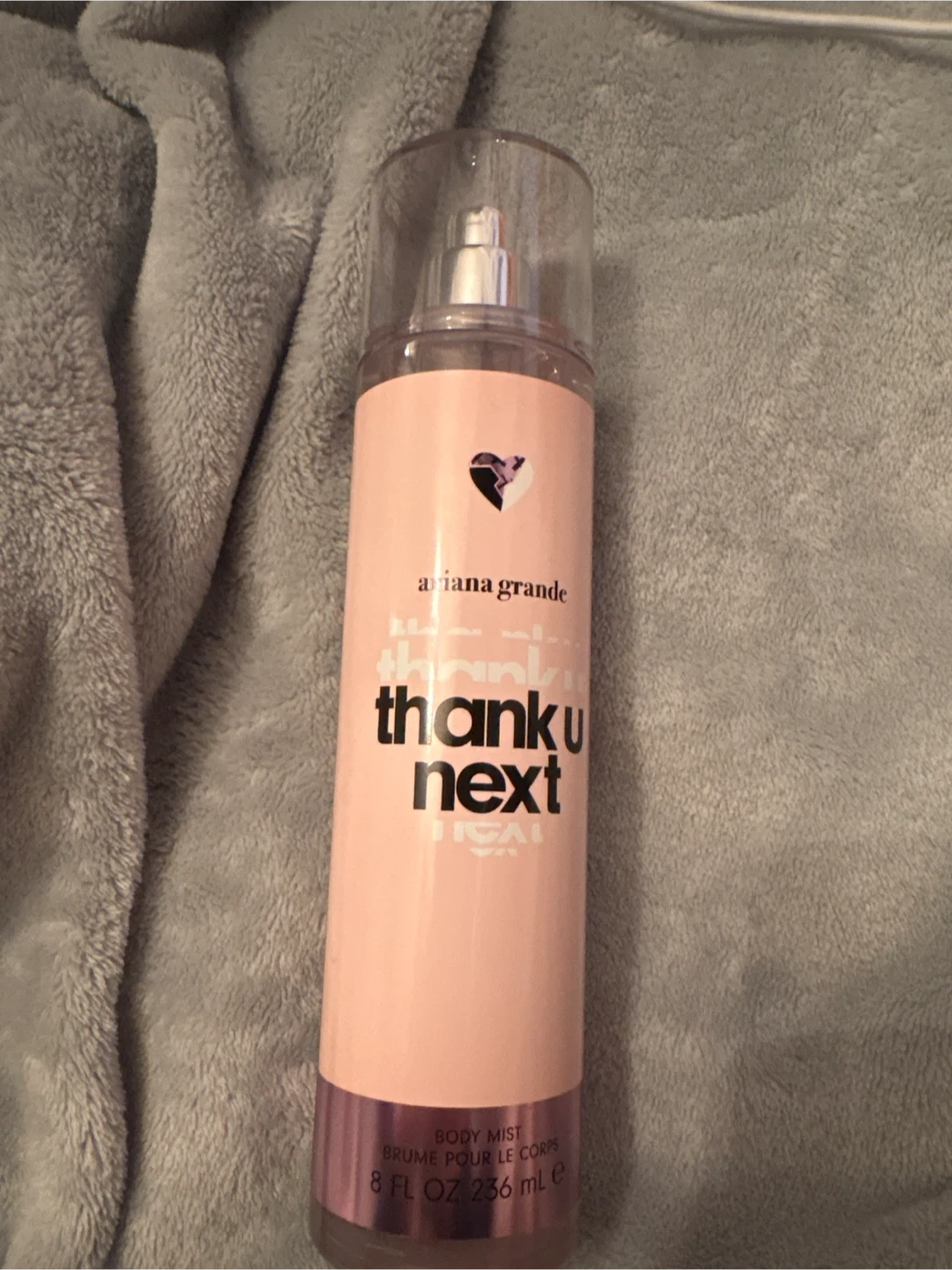 This is Ariana Grande's Thank U Next body mist. It's a body mist for the body. Comes in a 236 mL bottle.