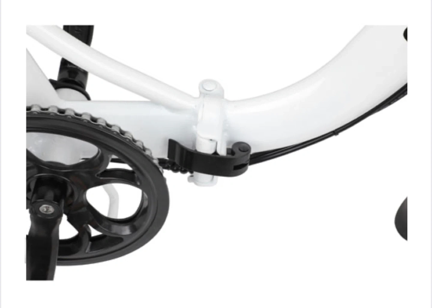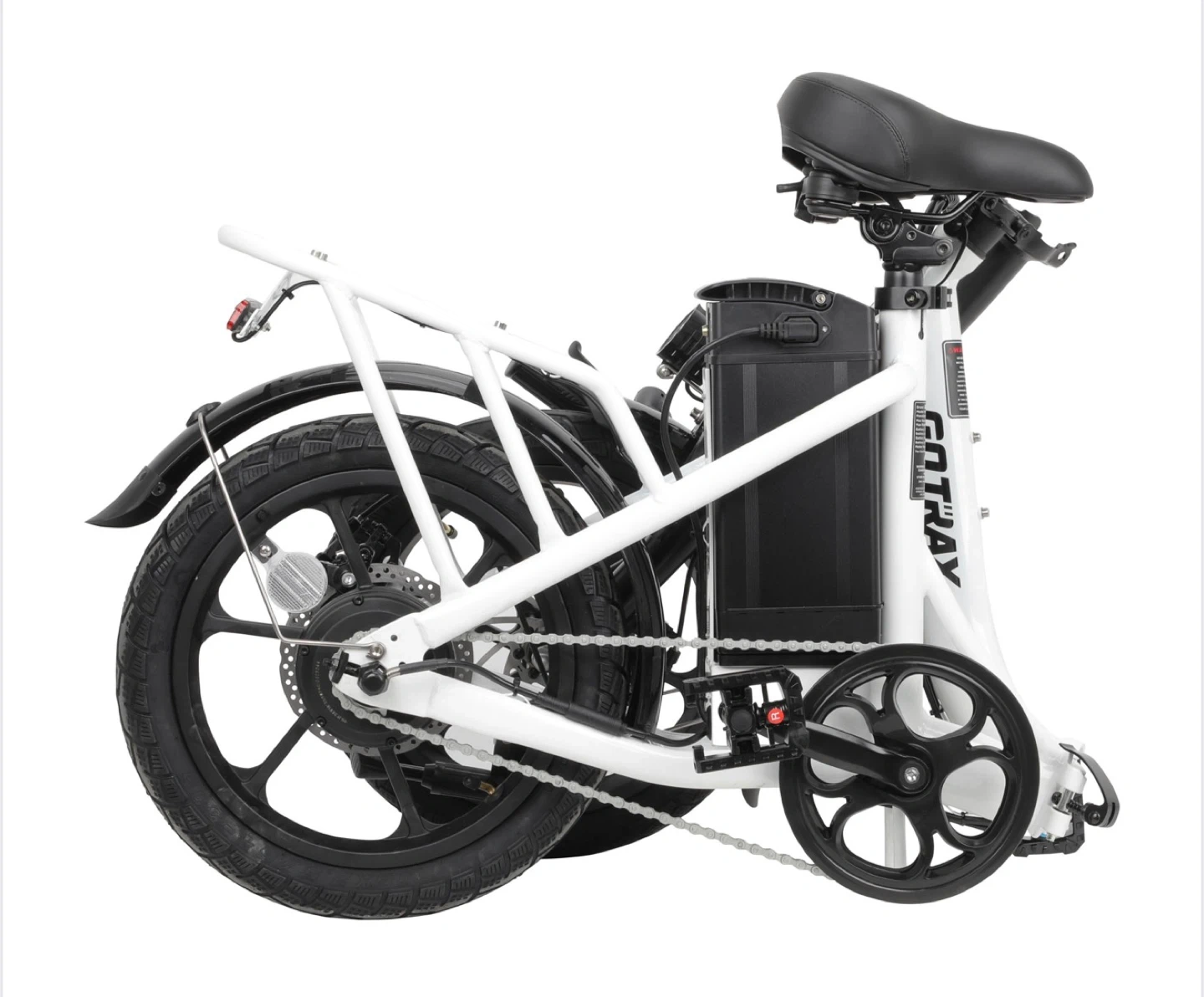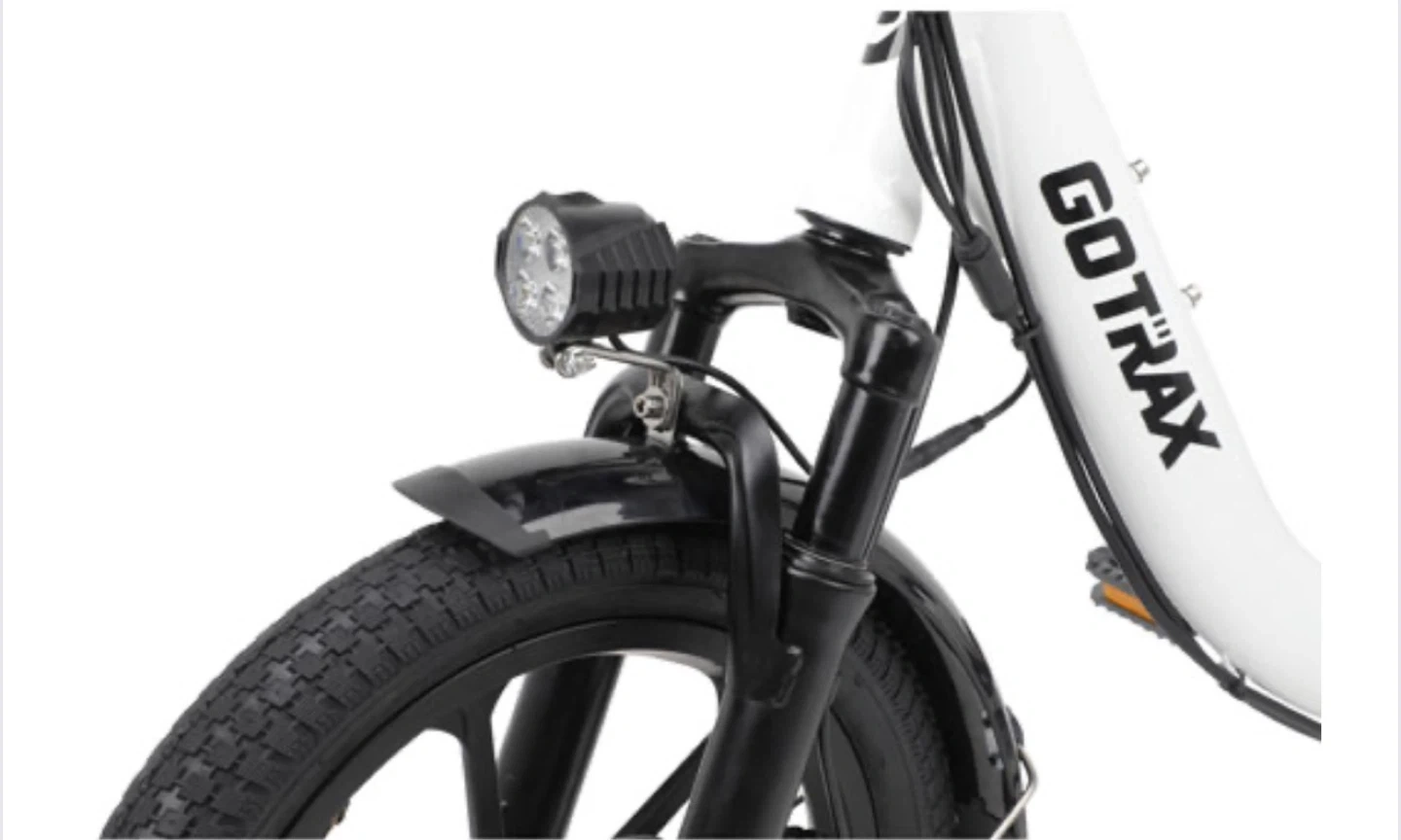 This is a GOTRAX folding electric bike in white. It's a compact e-bike designed for convenient commuting and portability. It features a built-in battery pack and a headlight for visibility. This bike folds for easy storage and transport.